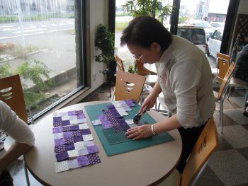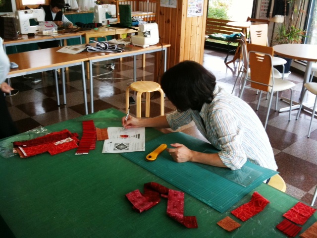 その中で、久しぶりの参加となる高橋さんを発見!なんと3年ぶりの講習会とのことで、少し険しい表情?…いえ、キルトのピースを裁断しているんですが、寸法を何度も確認しながら集中している様子(`~´)