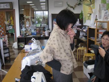 今日はまず、臼井さんが持ってきた着物のリフォームのブラウスのお披露目。