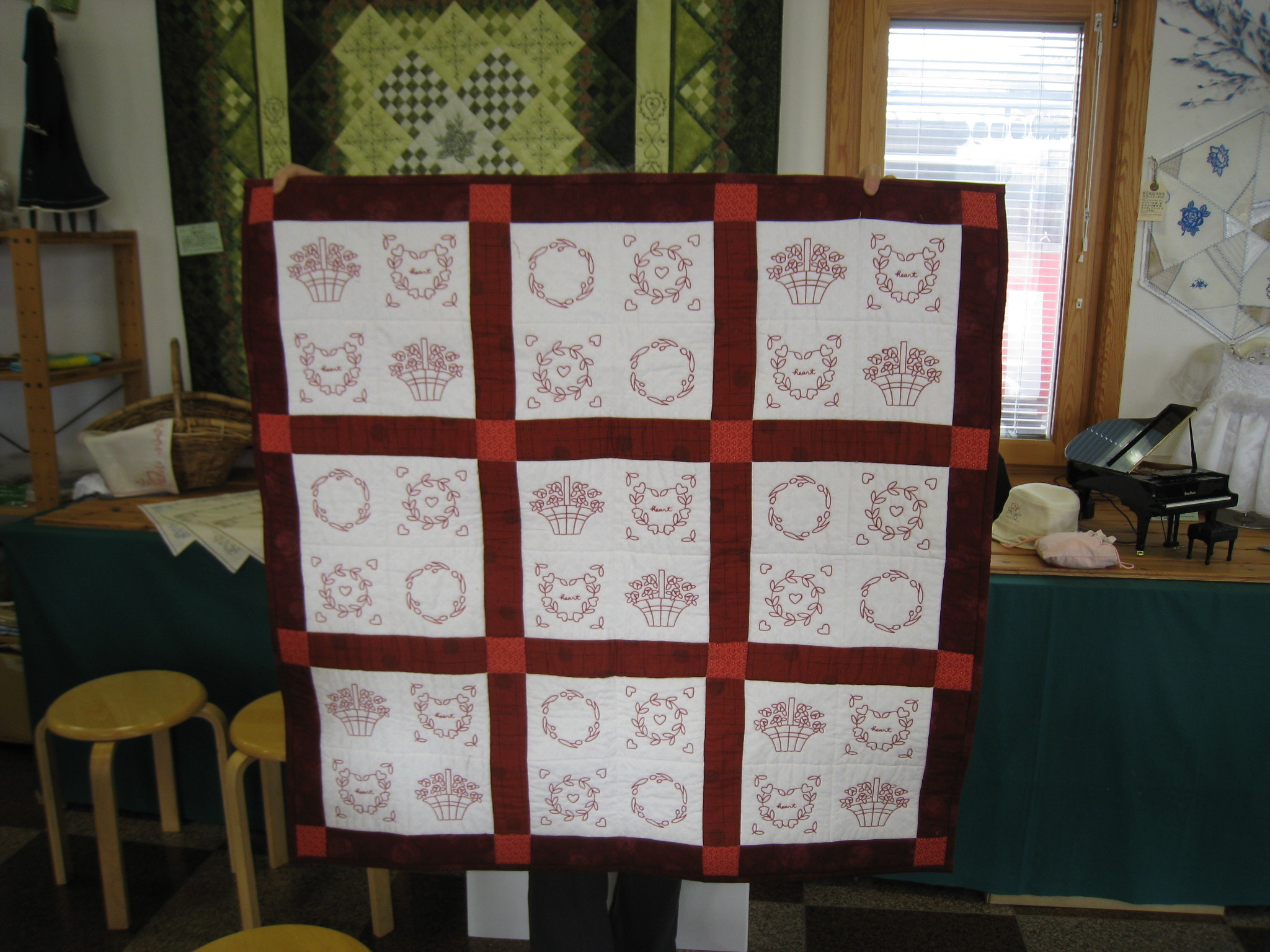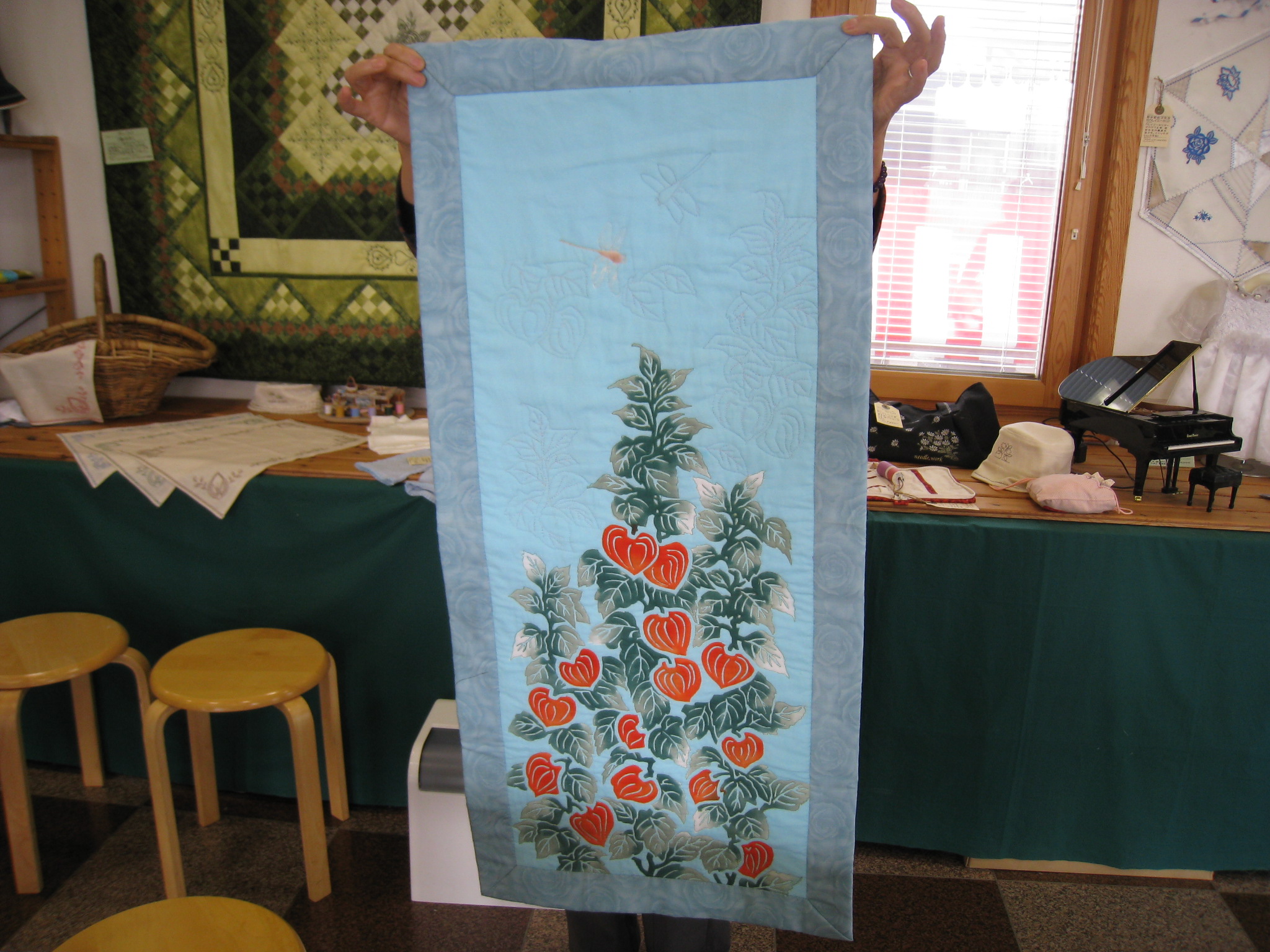 早坂さんはレッドワークのタペストリーと手ぬぐいの柄をフリーモーションで仕上げた