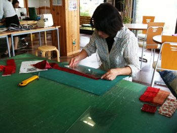 前回縫い合わせたところをローラーカッターで裁断するところから始めました。