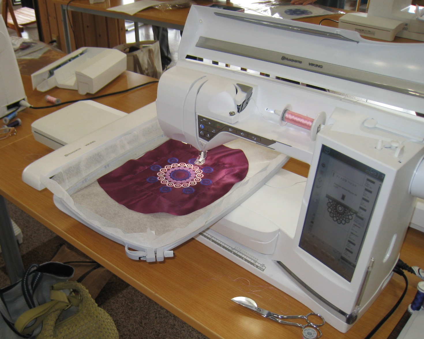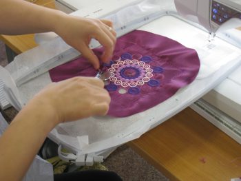 今回は刺しゅう枠に安定紙を張り、その上にサテン生地をのせてシツケ機能でとめています。その状態で刺しゅうしているんですが、つっぱることもなくきれいです。