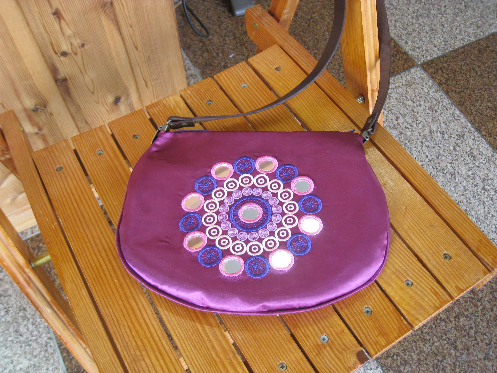 切り抜いた部分にミラーを裏から貼り、パイピングを挟み縫い合わせて完成です♪