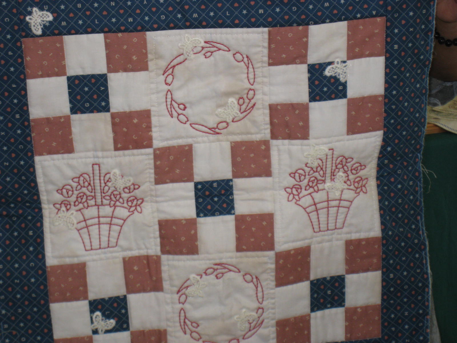 早坂さんが作成中のナインパッチのクッションですが、さりげないところに、白い蝶の刺しゅうが縫い付けてあります。これ実は旦那さんが『親切心』で刺しゅうの渡り糸を切ったところ、間違って『布』まで切ってしまい穴を開けてしまったそうです。そこに刺しゅうを縫い付けて上手くフォローしてます。さすがです。ちなみに早坂さんご夫妻は夜ご飯を食べ終わってから、仲良く二人でミシンを使っているそうです。うらやましい。理想のご夫妻ですね。
