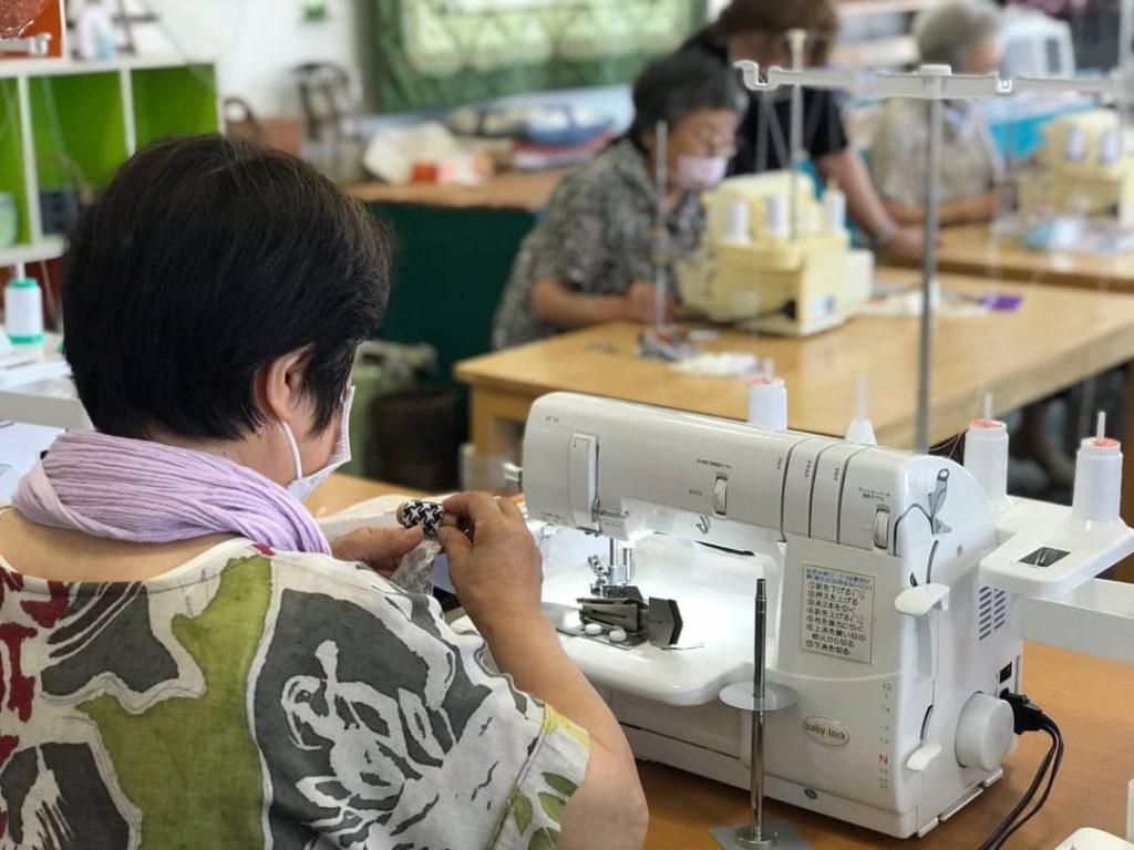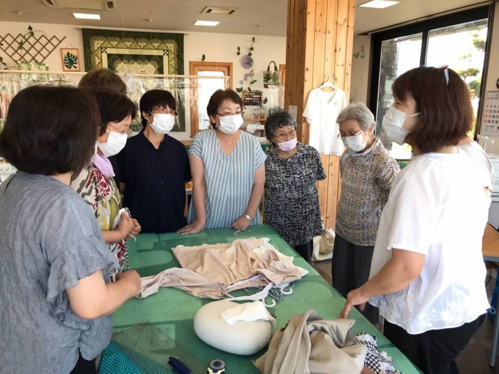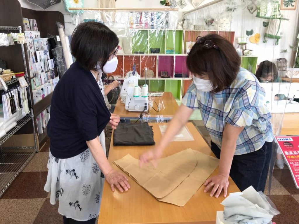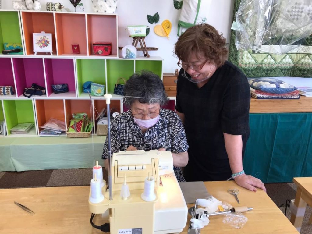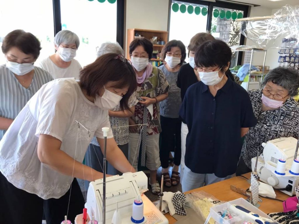 買っていただいたミシンを使って『帽子』『エコバッグ』そしてロックミシンで『カーディガン』の初回講習会を行いました。出来上がったときの笑顔が素敵でした。