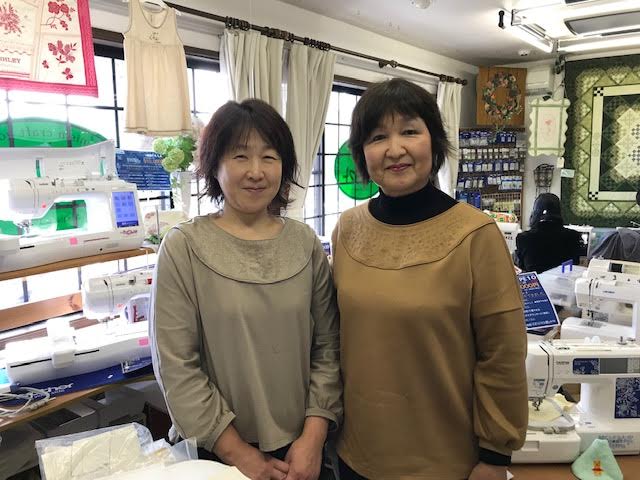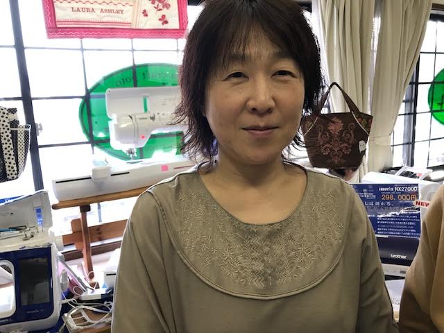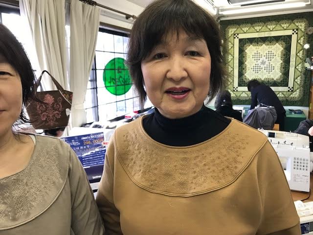 胸元刺しゅうのブラウス2018年12月24日更新 PRシリーズの内蔵模様を使ってニット地でブラウスを作りました。生地と同色の刺しゅうがいい感じです。松田さんと『ゆみさん』にっこり、写真に 難易度:★★作成時間:講習会3回程度カットソーニットソーイング