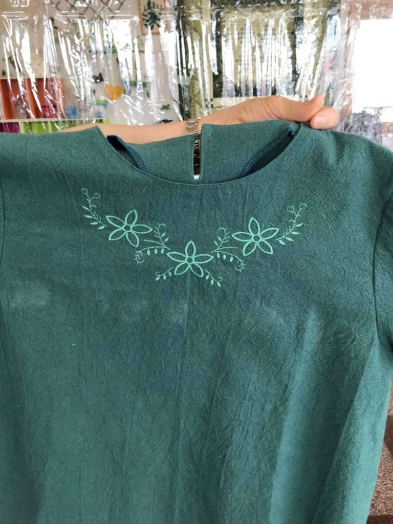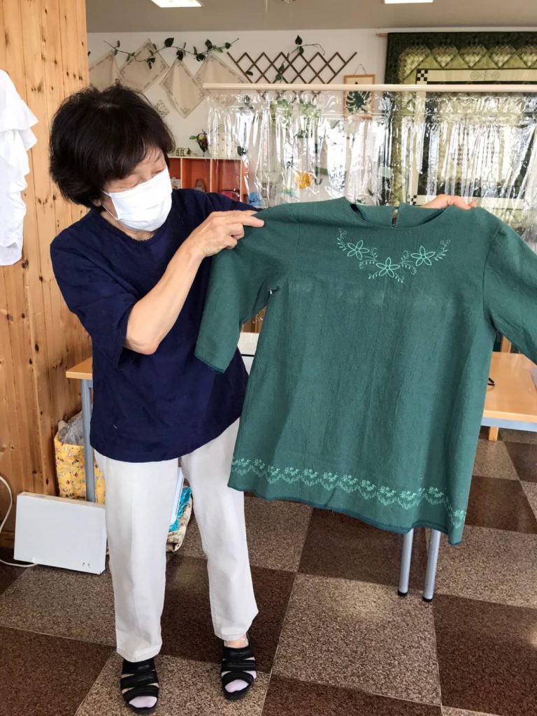 三ツ倉さんが作ったチュニック2021年08月05日更新今日は刺しゅうの講習会 三ツ倉さんが作ったチュニックです。 緑地に緑の刺しゅうが素敵です。裾にもぐるりと刺しゅうをしています。 使用カード 『ホワイト刺しゅう』 難易度:未登録作成時間:未登録刺繍入り洋服