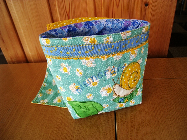 ブラザー特別講習会での作品です。かわいいアップリケ刺しゅうを施し、テープの端にはシェルタックを使っています