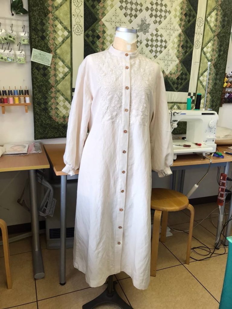 「ワンピース」2022年02月13日更新今回の三静さん(生地販売のお店です)で、このワンピースを作る為に買って来た生地です。胸の所に刺繍を入れて生地作りから楽しんでます❣️すてきにハンドメイドの2021.10月号のワンピースの裾と袖を変えて作りました。水仕事が苦にならない楽チン袖です😊そして、体型も気にならないのが最高ですね! 難易度:未登録作成時間:未登録ワンピース刺繍入り講師作品