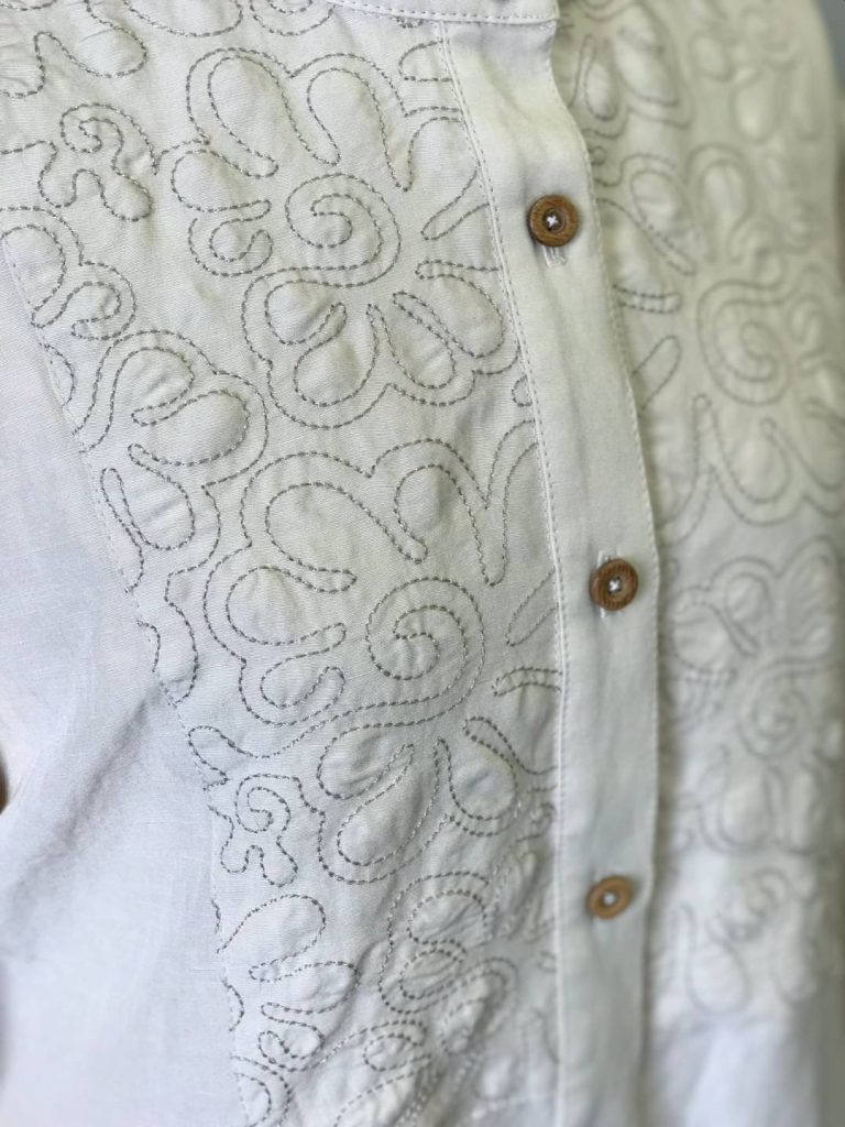 「ブラウス」2022年04月14日更新ブラウスを2着作ってみました。 1着目は胸の刺繍を薄いグレーの糸で。 前開きなので着やすいです。 2着目は刺繍を白糸で。 ほとんど目立ちません😂 背中のスリットを、かなり深くしないと頭が通過せず…。 どちらもパンツに合わせると、スッキリとして着やすいデザインです。 これから春に向けて作りませんか? 難易度:未登録作成時間:未登録ブラウス刺繍入り