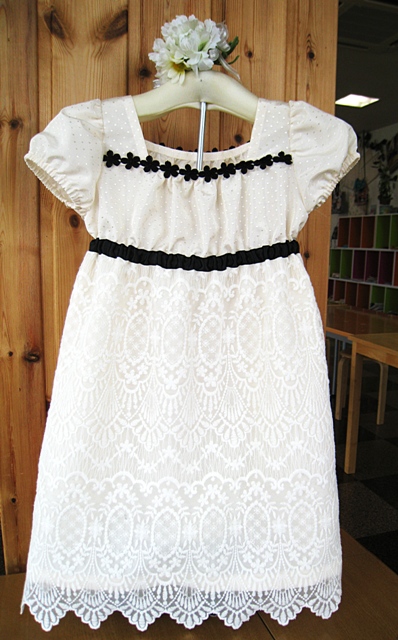 ドット柄の生地にレースを乗せて仕上げています。裾はスカラップを利用してカットしてあります。