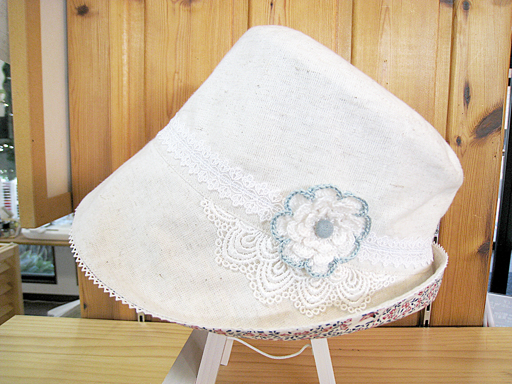 麻の生地と花柄のリバーシブルです。レースが大人っぽい感じに仕上がってます。