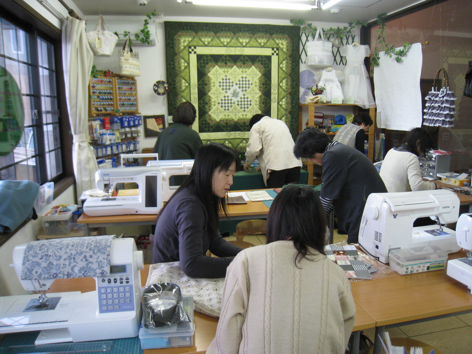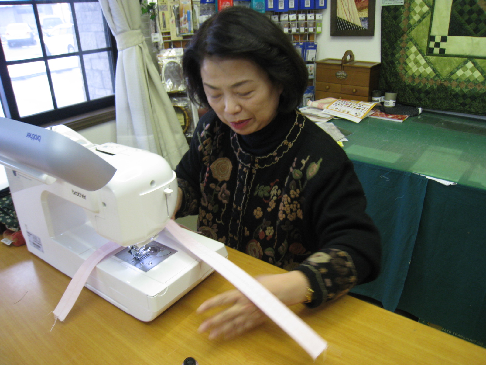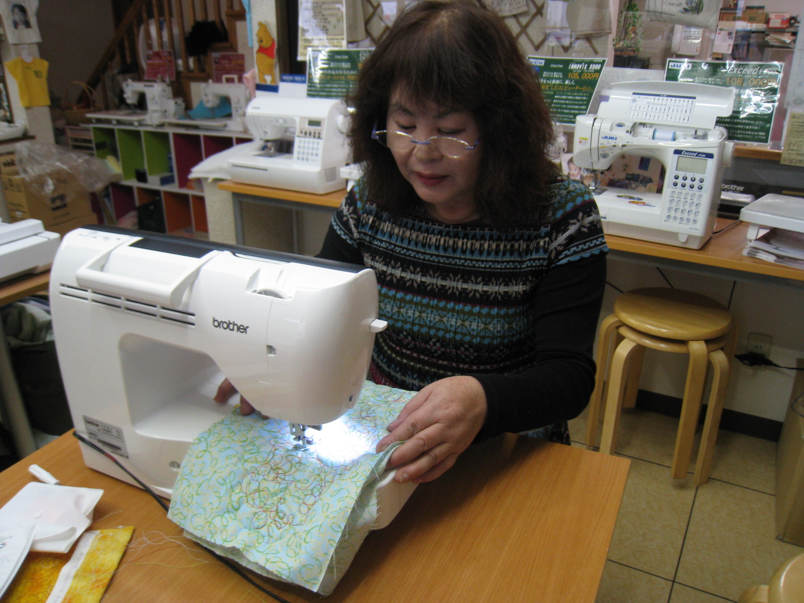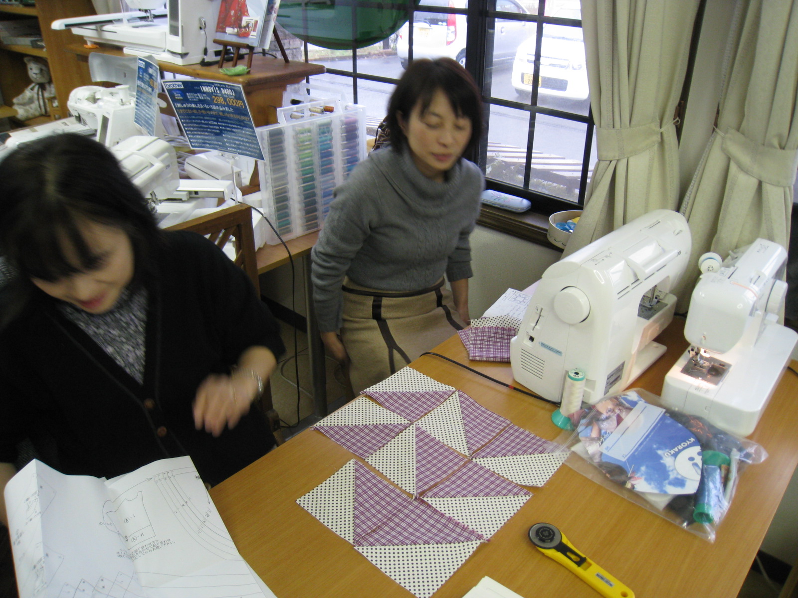 今日の講習会は午前の部4名、午後の部3名の参加でした。 だんだん年末に近づいてくるためか、風邪が流行っているせいか、少な目の参加人数です。 岩木さんと藤島の五十嵐さんはたたみの縁のバッグ作り、美智子さんはハワイアンキルトの 長財布、後藤さんはイブニングスターのタペストリーを製作中です。 後藤さんは先週までのクイックキルト講習から応用してのタペストリーで、残り布を上手く使って います。最初見たとき、イタリアの国旗の色のように感じましたが、きれいな色使いで 出来上がりが楽しみです。 いつもは金曜日参加の竹澤さん。先々週から親戚の子供さんの『入園セット』を作成中です。 今日はその中の絵本バッグと着替え袋に取り掛かっています。突然『かわいい』と自画自賛の 声。絵本バッグの持ち手にスカラップと花模様のステッチをかけていたとき、レースのような 仕上がりになり、あまりにも可愛らしく仕上がったため思わず声が出たようです。自画自賛でした が、他の方も『かわいい』と口々にほめていました。 それときのうの夕方来た修理を午後から始めました。『ジグザグを縫うと針が下がらない』と いう症状です。お聞きしたところ、最初の頃はちょっと使ったけど、その後8年くらいまったく 使ってないとのこと。確かに、8年前のミシンと思えないほどきれいなミシンです。 よく見ると、針棒クランクが固着しています。そのせいで、針棒の横振りができずに結果的に 針棒が下がらないということでした。この場合、針棒台ごと外して固着した所の固まった油 を取り除いて、新たに油を差して、針棒が左右に動くようにして組み付け点検して修理完了です。 やっぱり機械は動かさないと調子が悪くなります