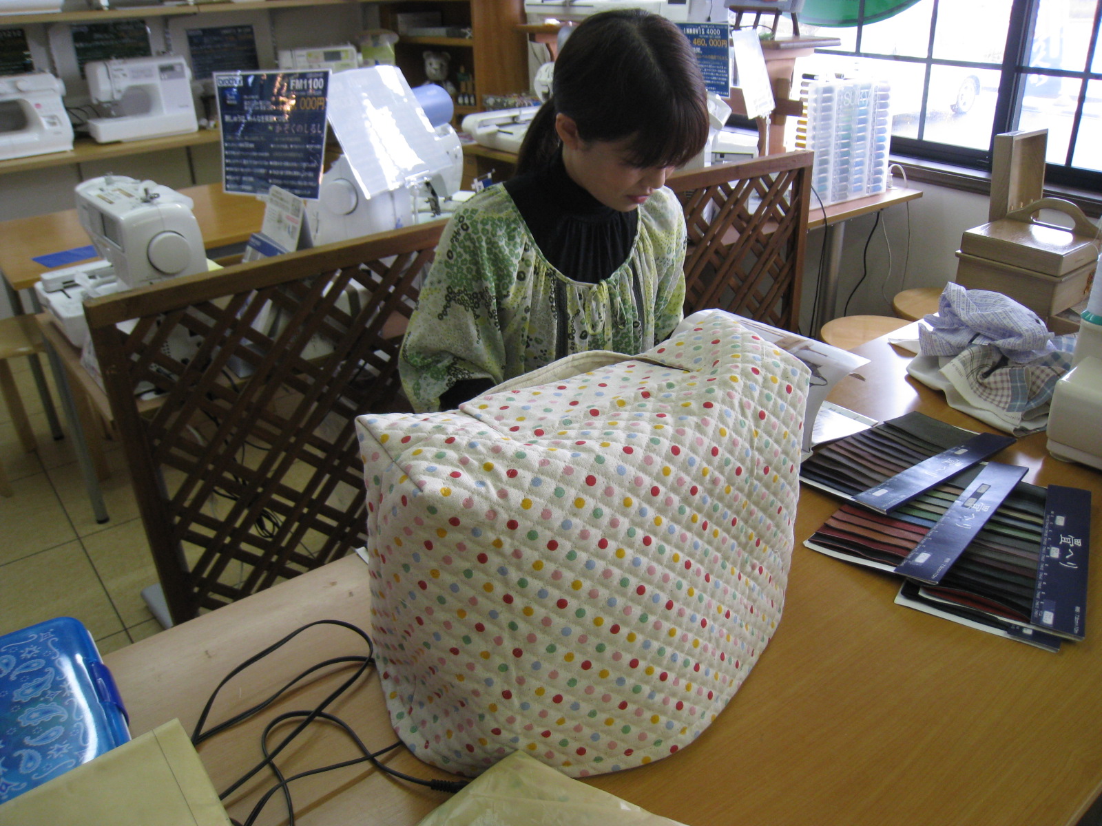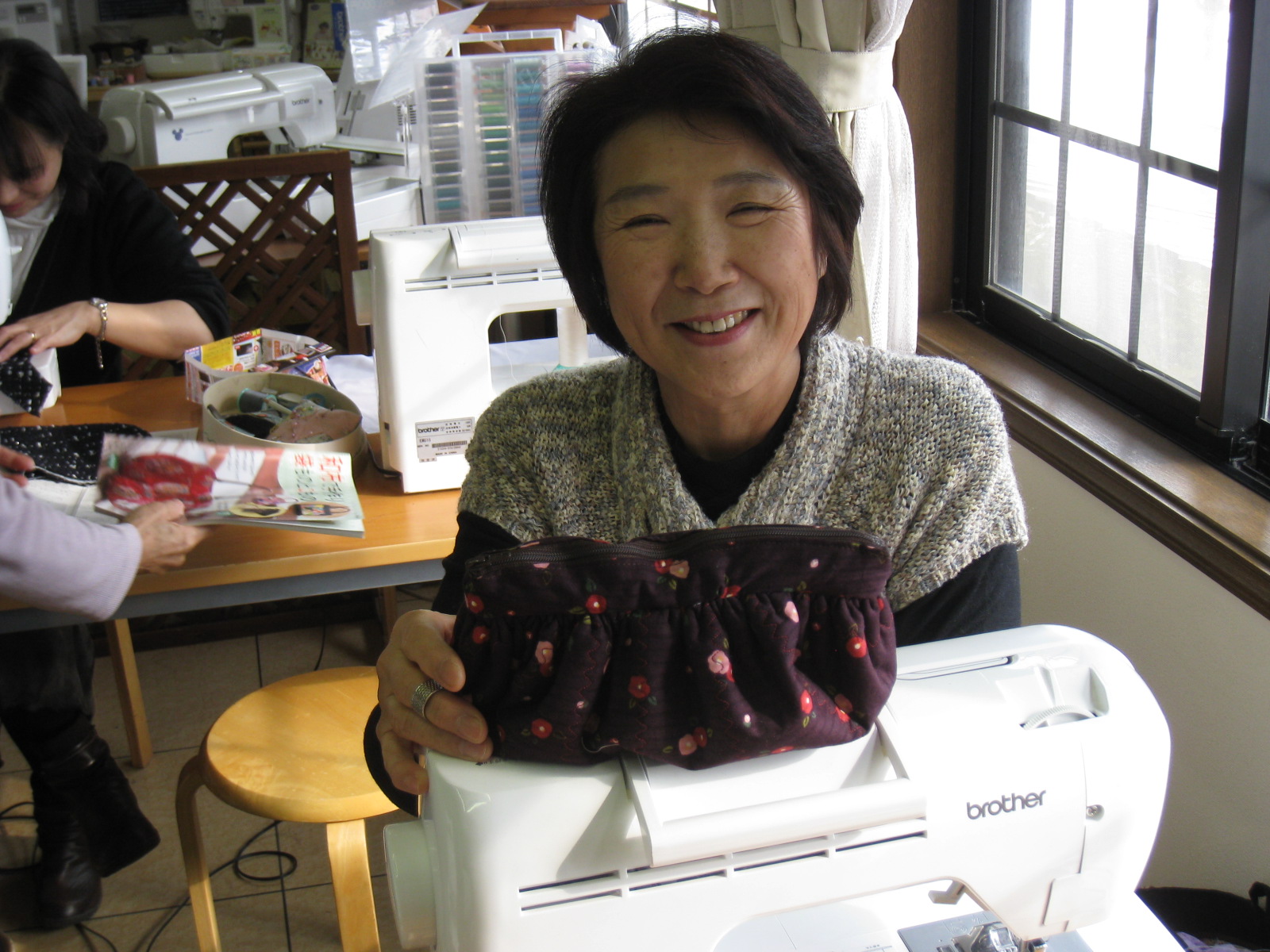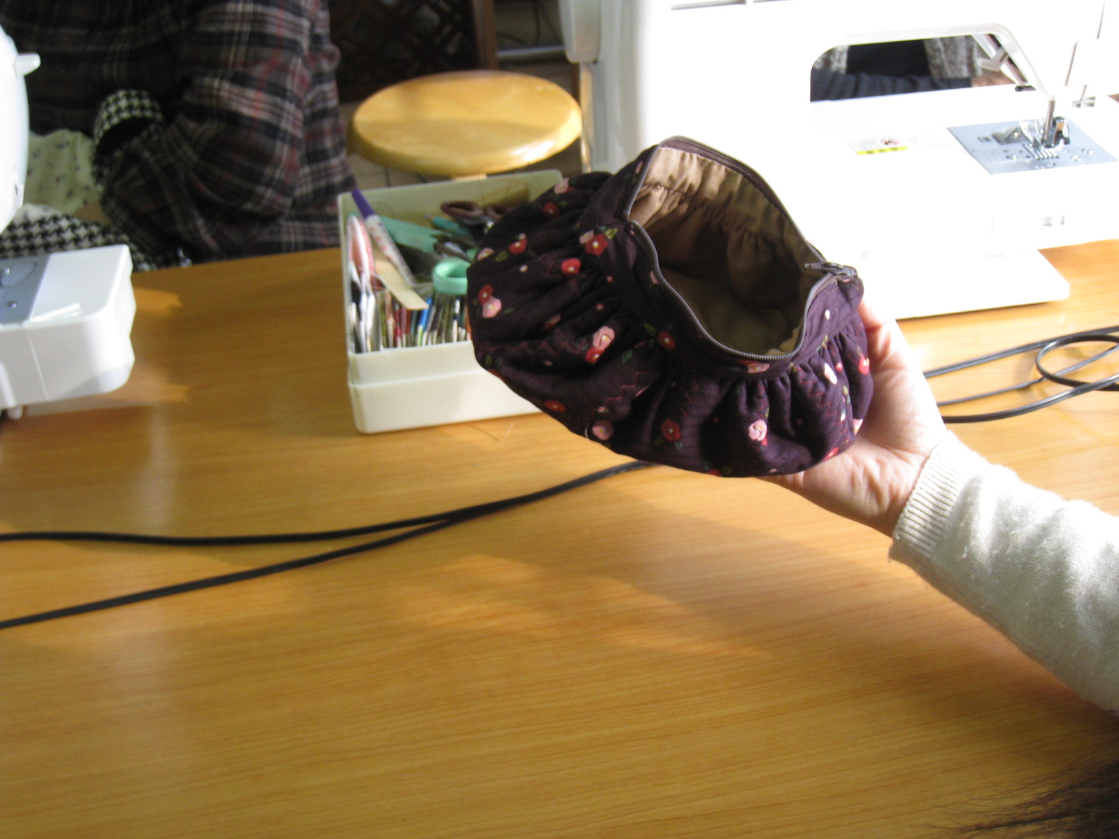 大東町の富樫さんはポーチを作成中。中綿入れて、ギャザーを寄せてと なかなか難しい物に