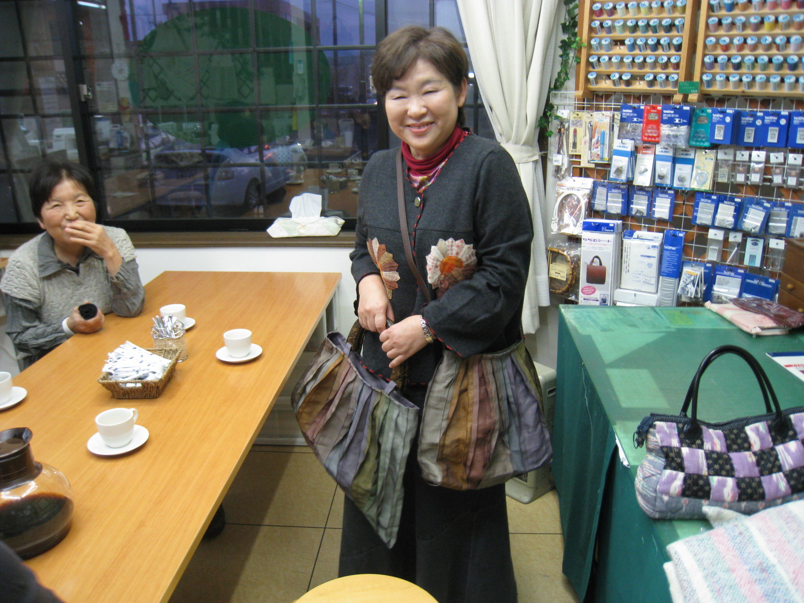初めて参加の佐藤さんと工藤さん。佐藤さんは、タタミのヘリのバッグ作り。工藤さんはエプロン