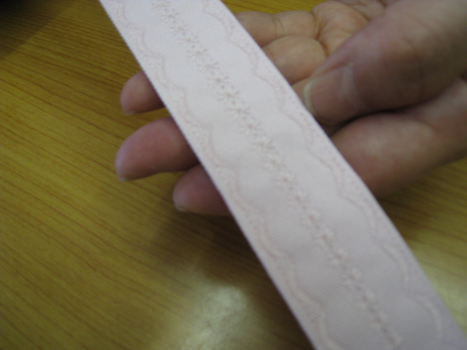 声。絵本バッグの持ち手にスカラップと花模様のステッチをかけていたとき、レースのような