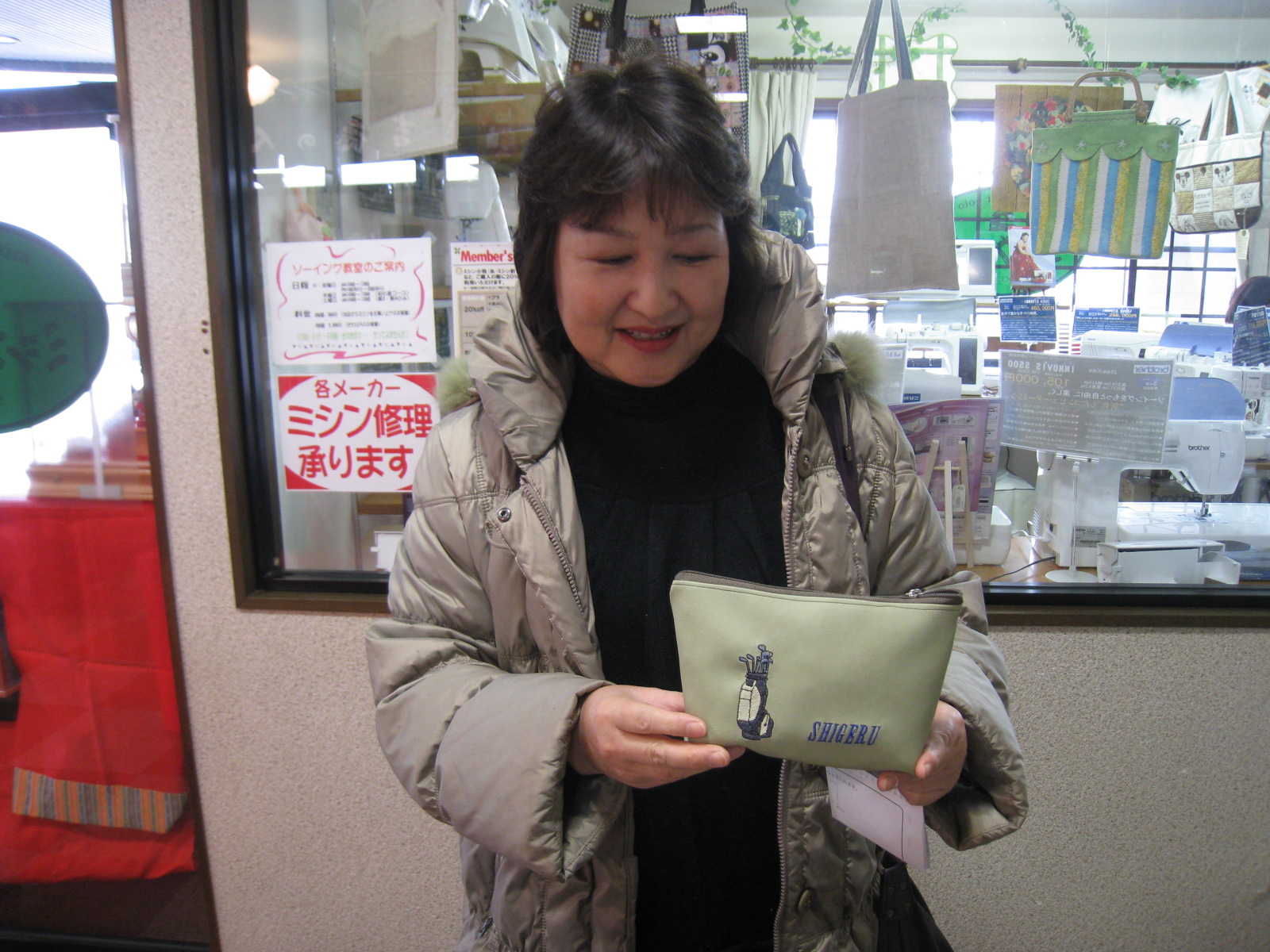 中綿もきれいに入れて、照れながら、ハイポーズ。化粧品入れによさそうなポーチだね!と