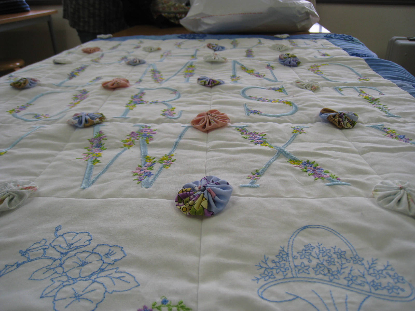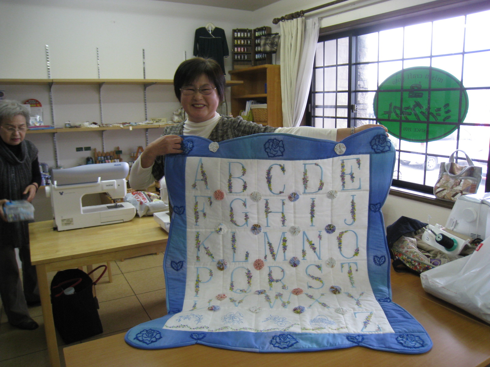 アルファベットの刺しゅうまで出来たもの(刺しゅう26個分)を見せてくれてましたが、それに