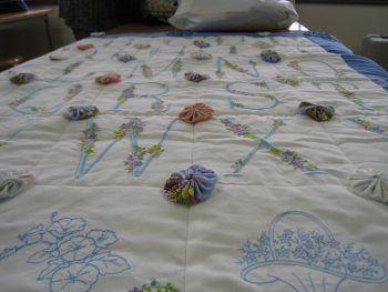 ボーダーをつけて、そこにバラの刺しゅうやヨーヨーキルトを貼り付けた完成品を持ってきて