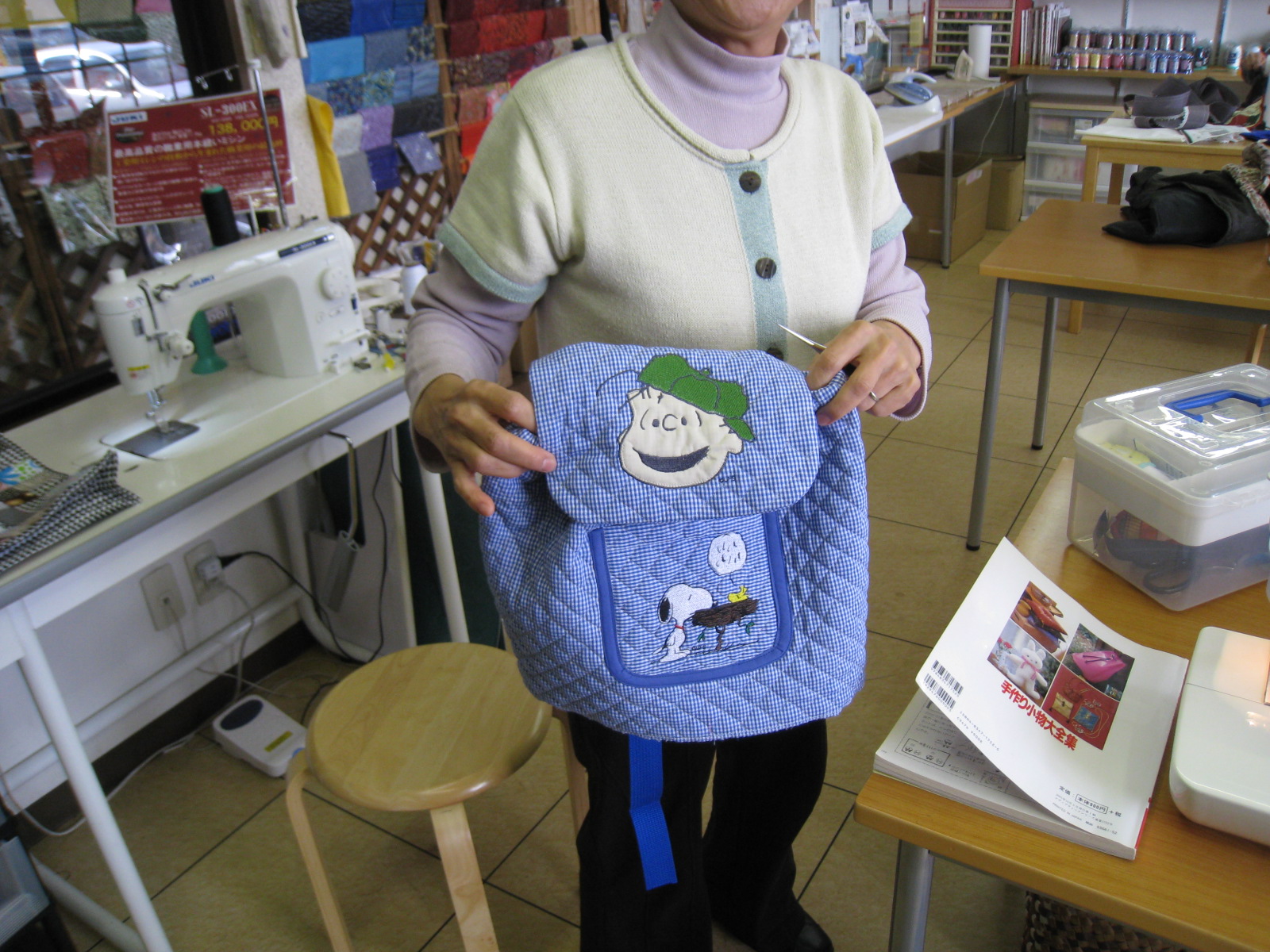 今回は、その代わり?に『スヌーピー』の柄の刺しゅうを入れたリュックの作成だそうです。お孫