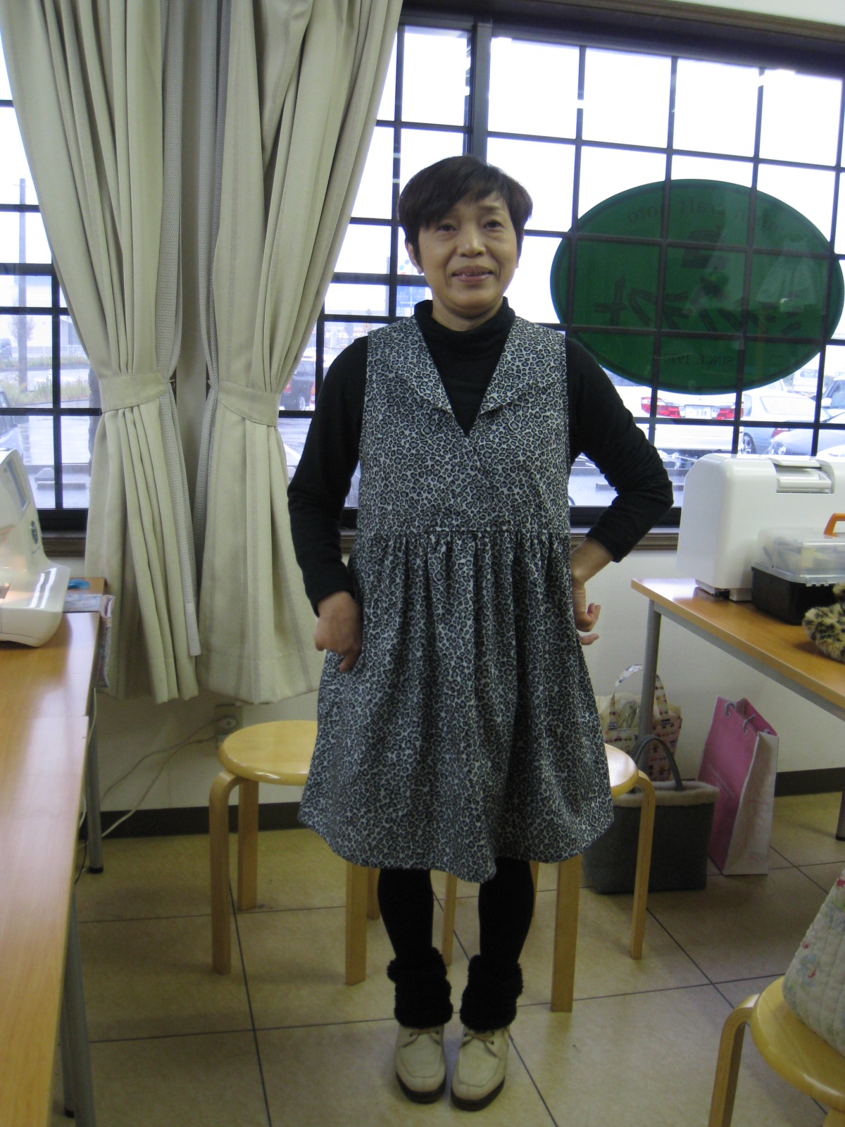 飯白さんが先週から作成中のアニマルプリントのワンピースがほぼ完成しました。