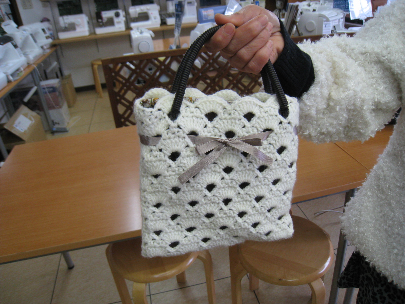 飯白さんは、手編みのバッグ(裏地付)を持ってきてくれました。白の編みこみがおしゃれで