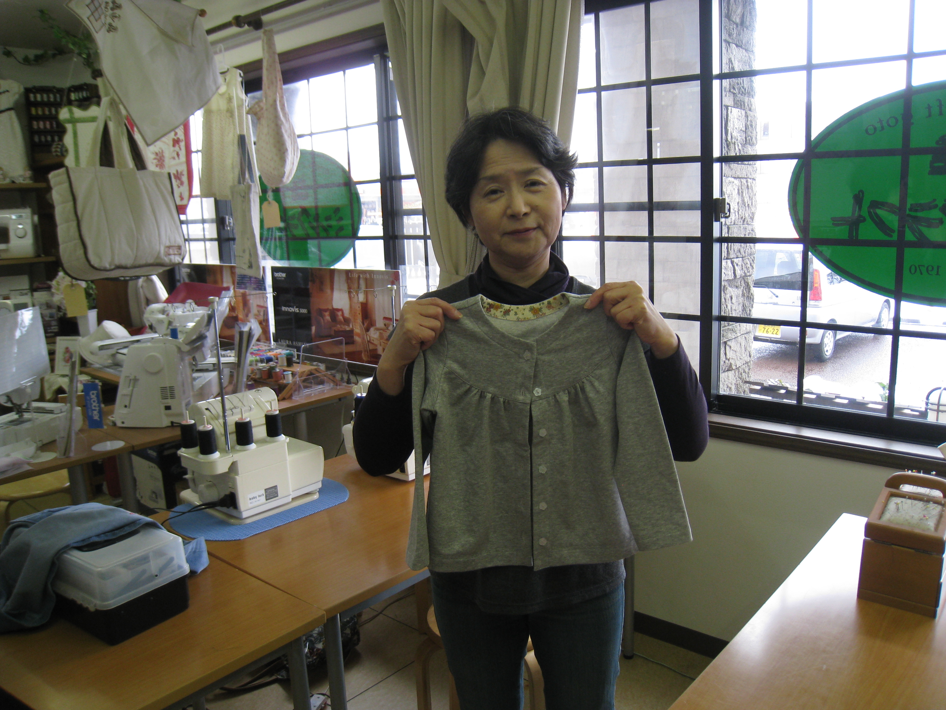 木村さんがお孫さんに作ったカーディガンをお披露目してくれました。襟ぐりの小花の