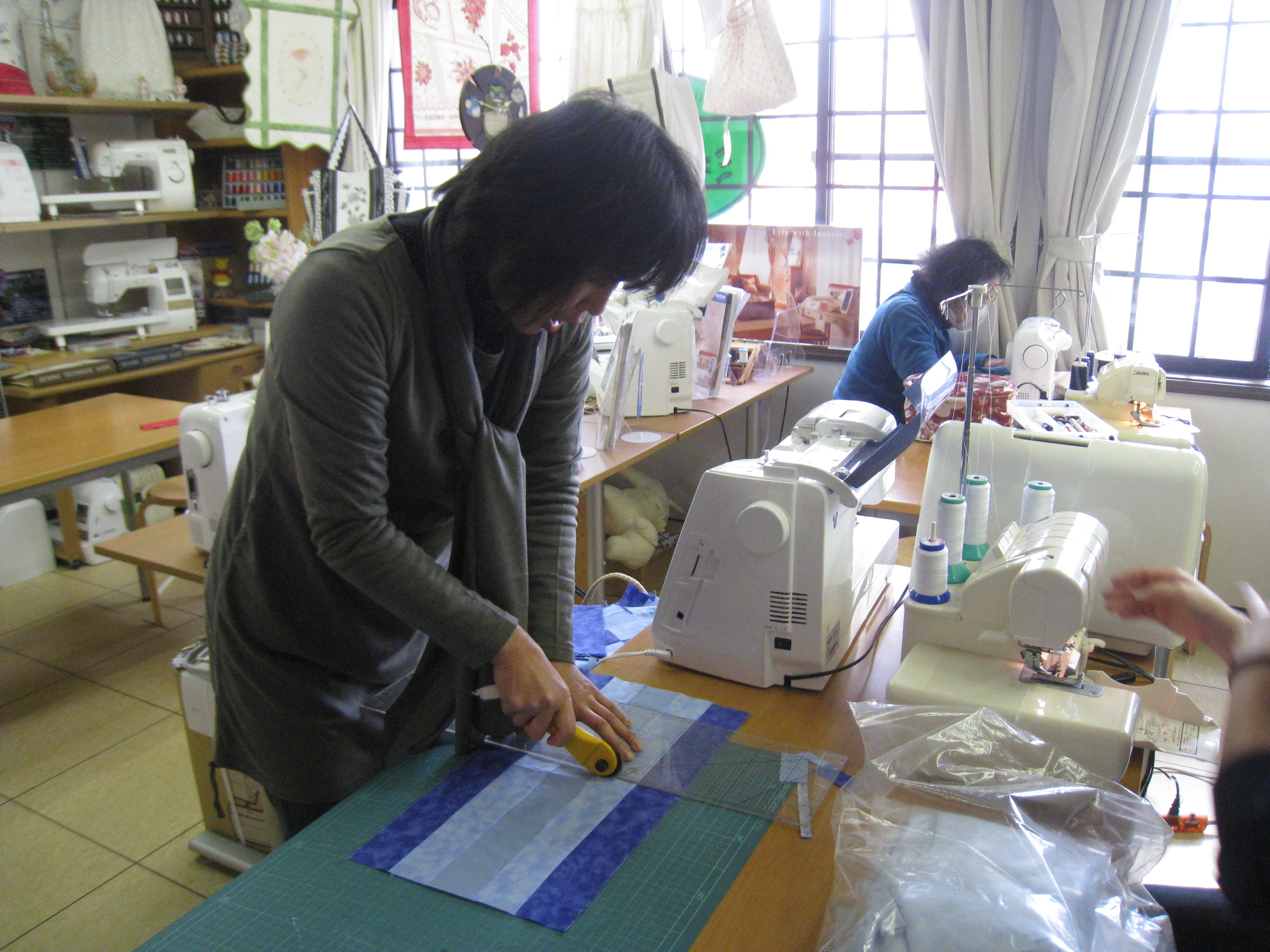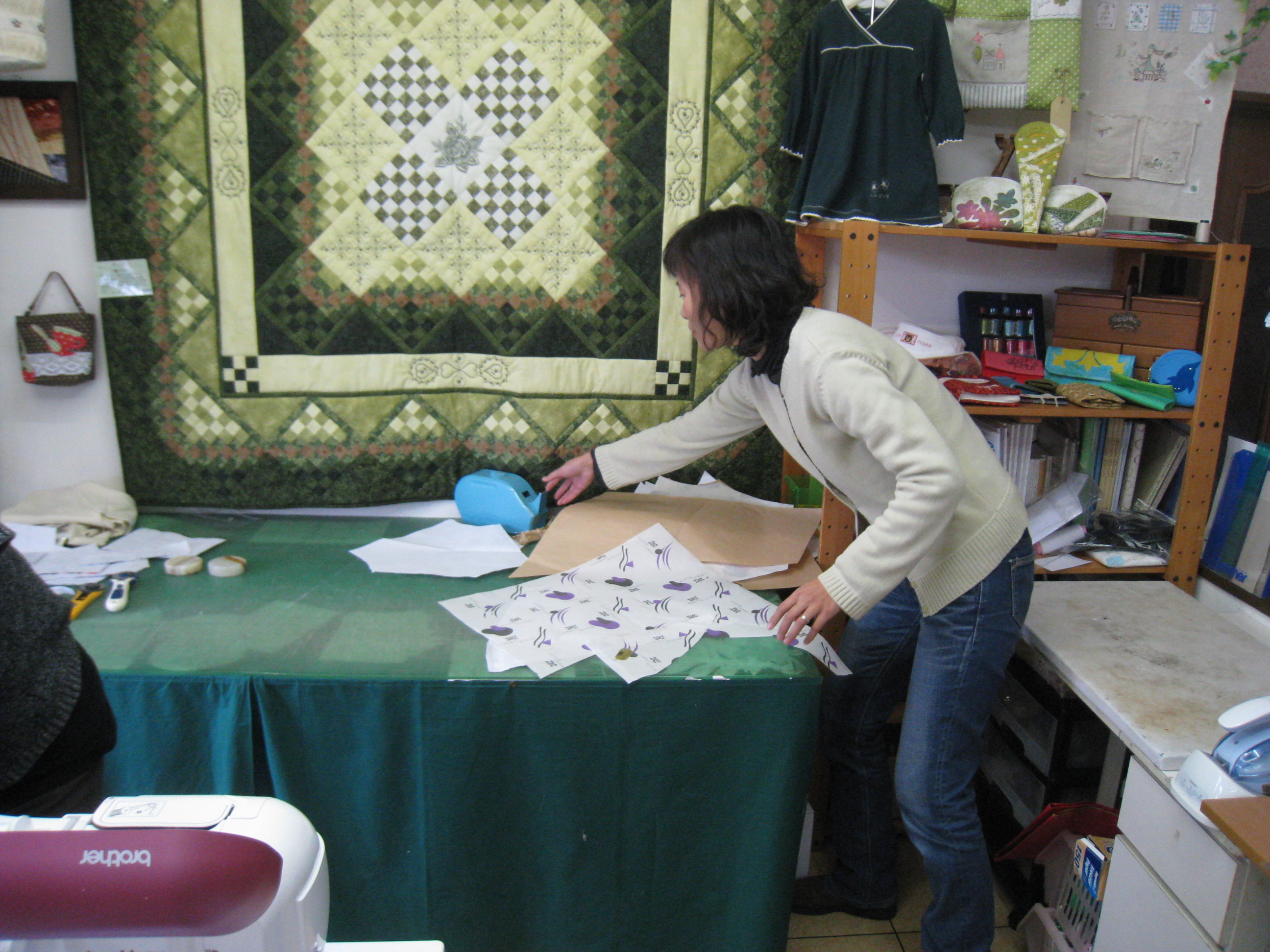 初めての大物のキルト作りだそうです。今日はひたすら、落としミシンに集中していま