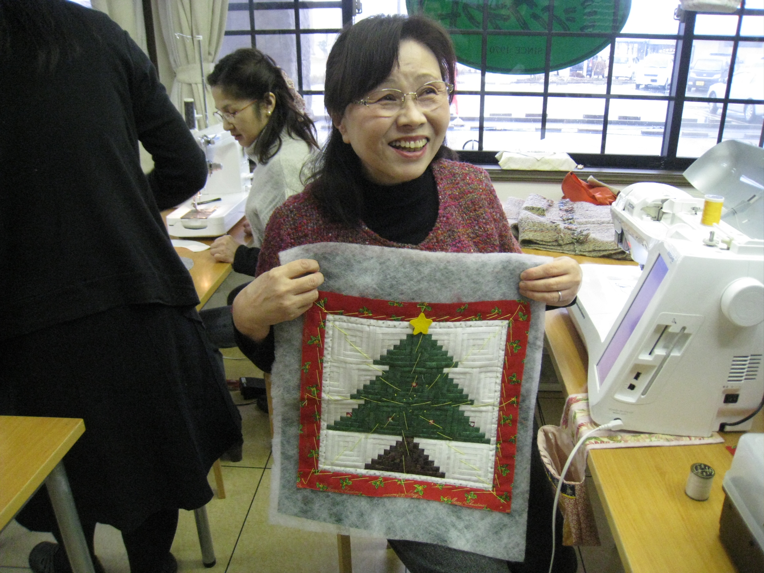 午前参加の神部さん、ログキャビンのミニクリスマスタペストリーを作成中です。それを