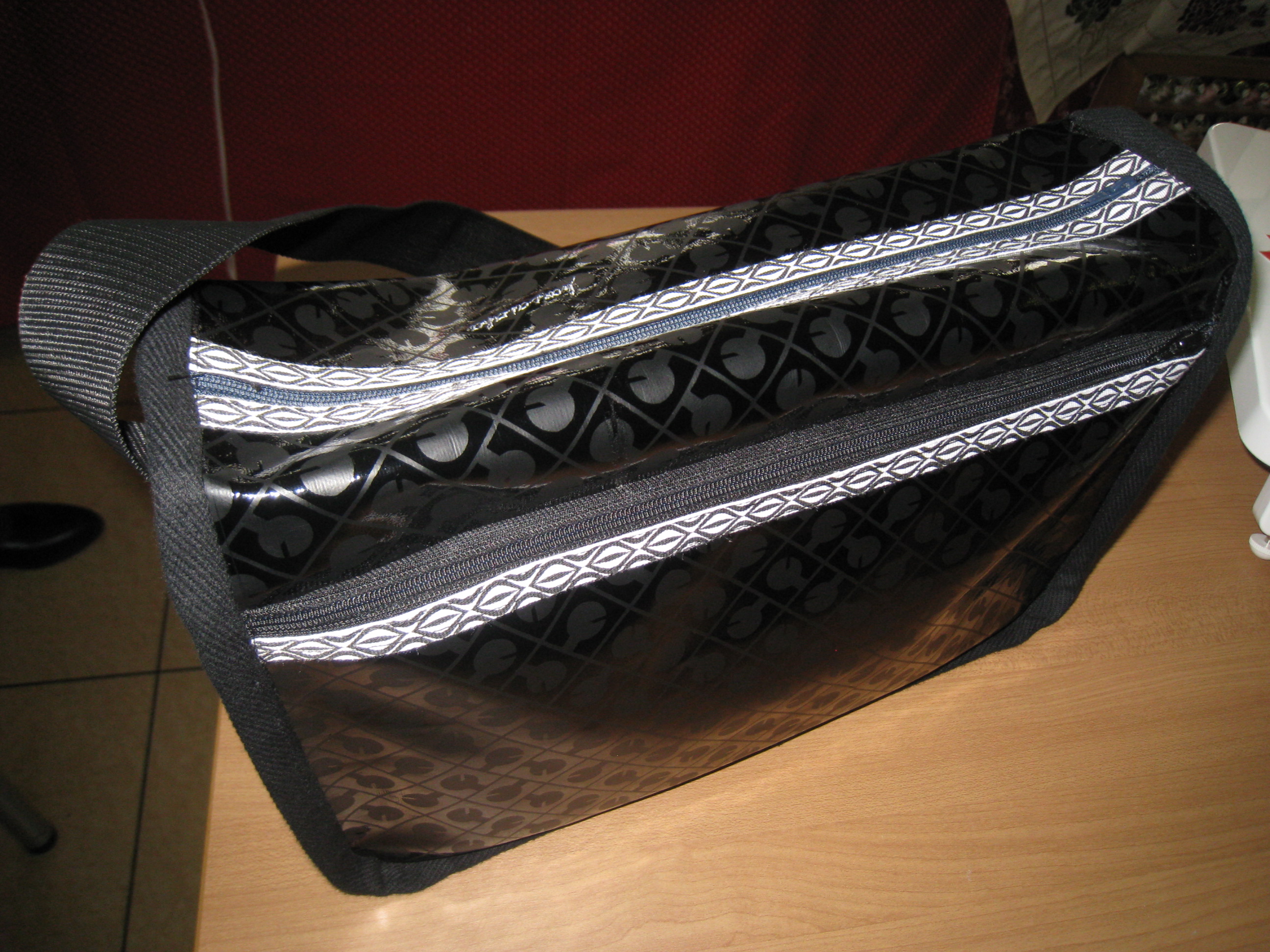 『うわさ』のバッグです。ビニール素材を上手く仕上げて作り上げています。まるで、既製品の