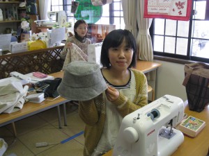 それから、今日始めて参加の三川の陽子さん。初回講習の『リバーシブルの帽子』の完成