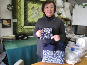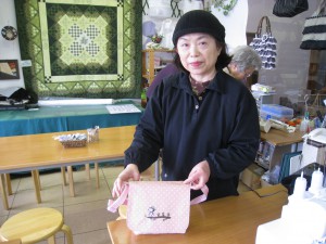 粕谷さんは風呂敷を表地に使った、スラッシュキルトの『ポーチ』と『バッグ』を見せてくれました。