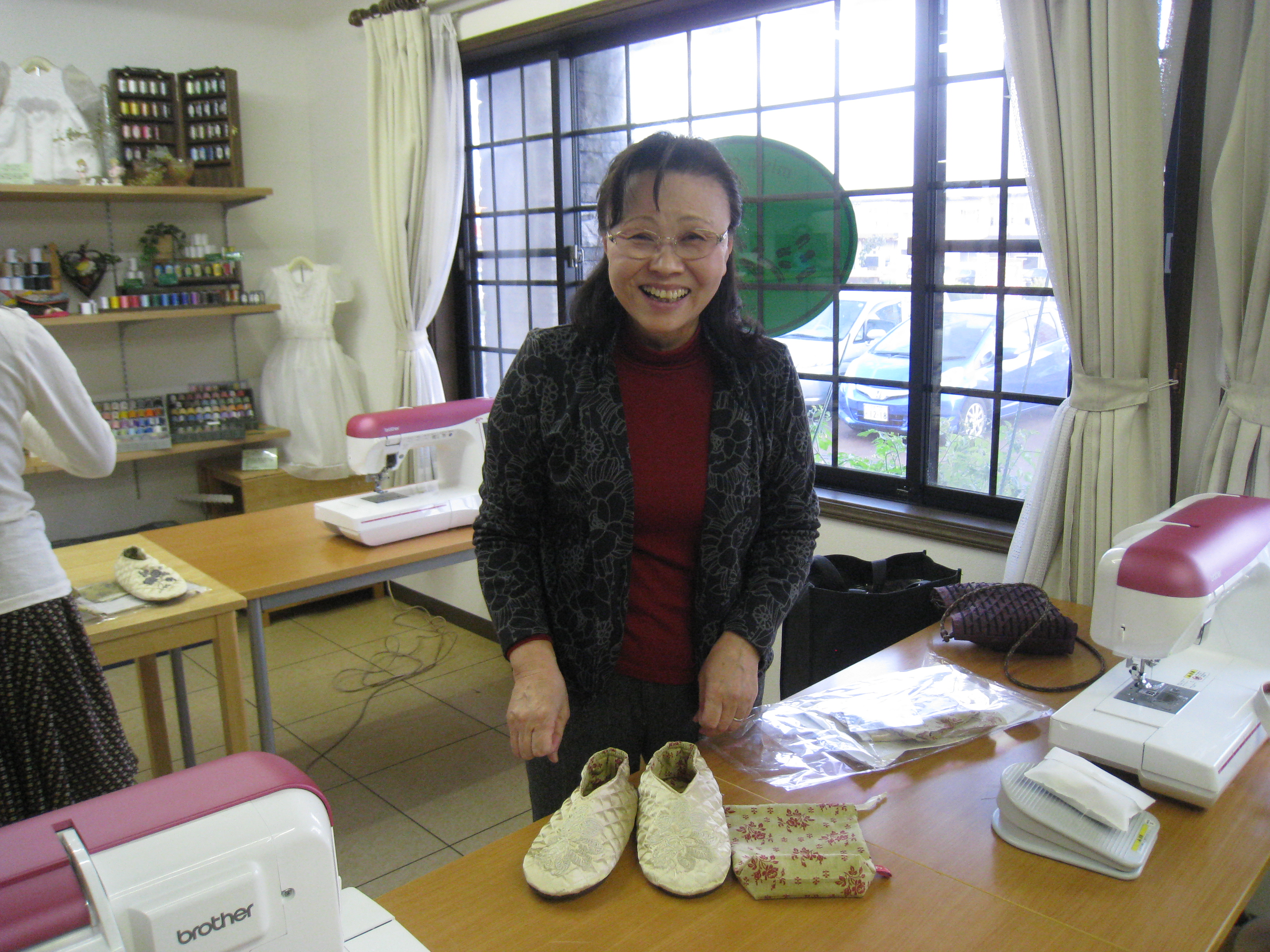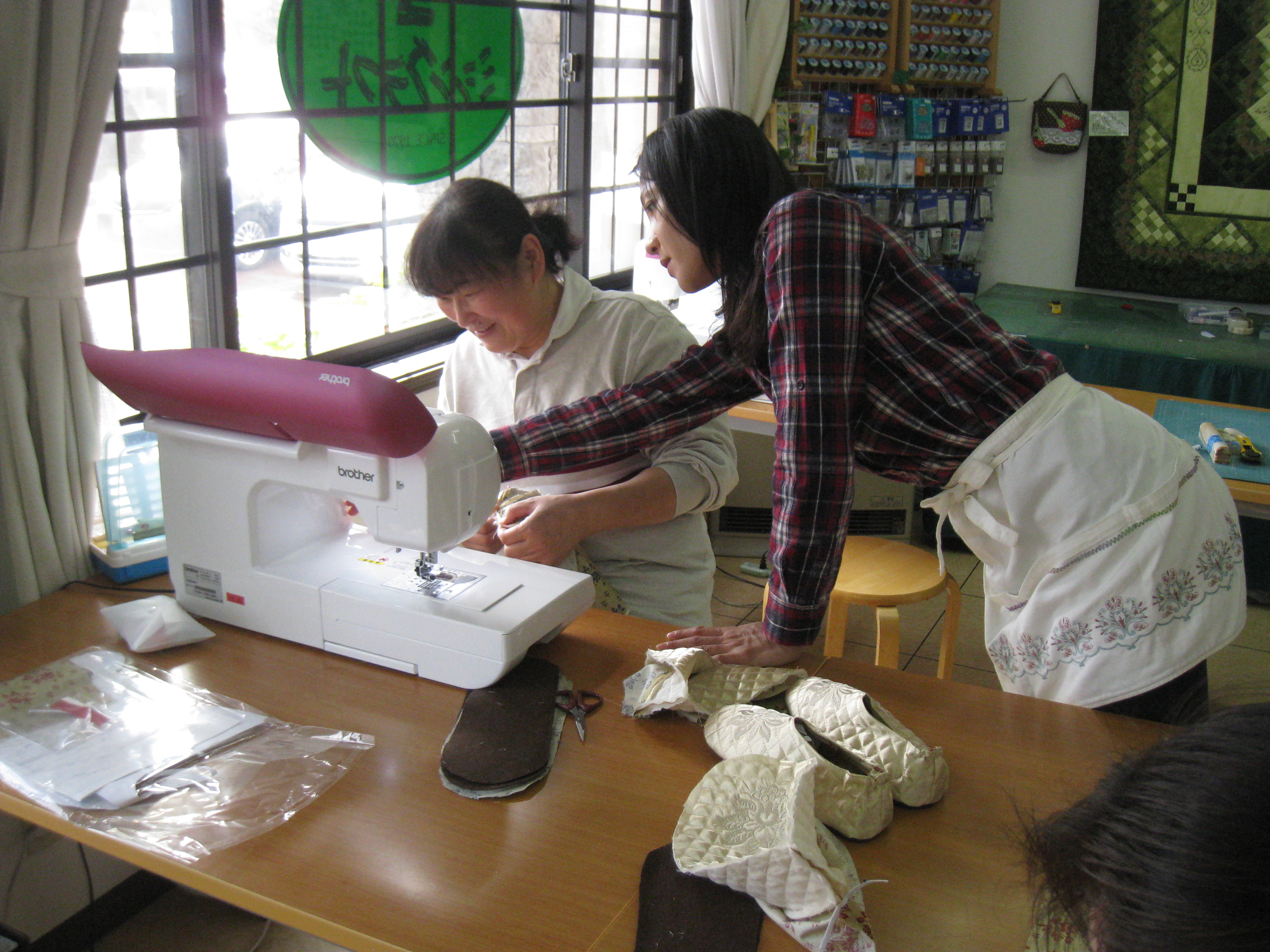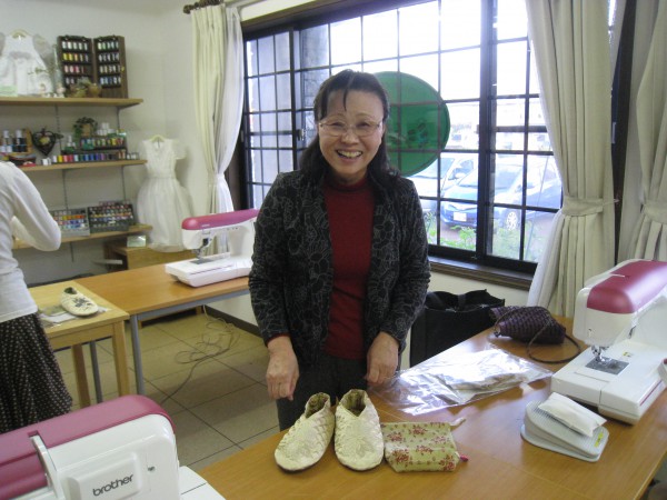 今日は特別講習会二日目『ローラアシュレイのルームシューズとアイマスクと巾着作り』