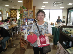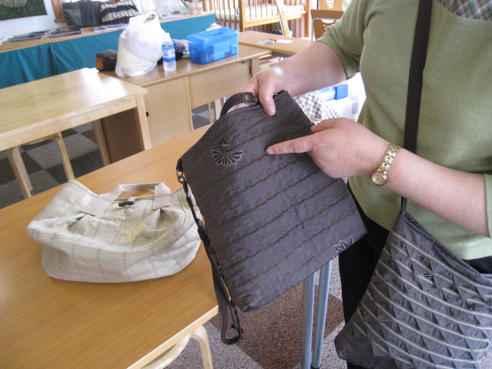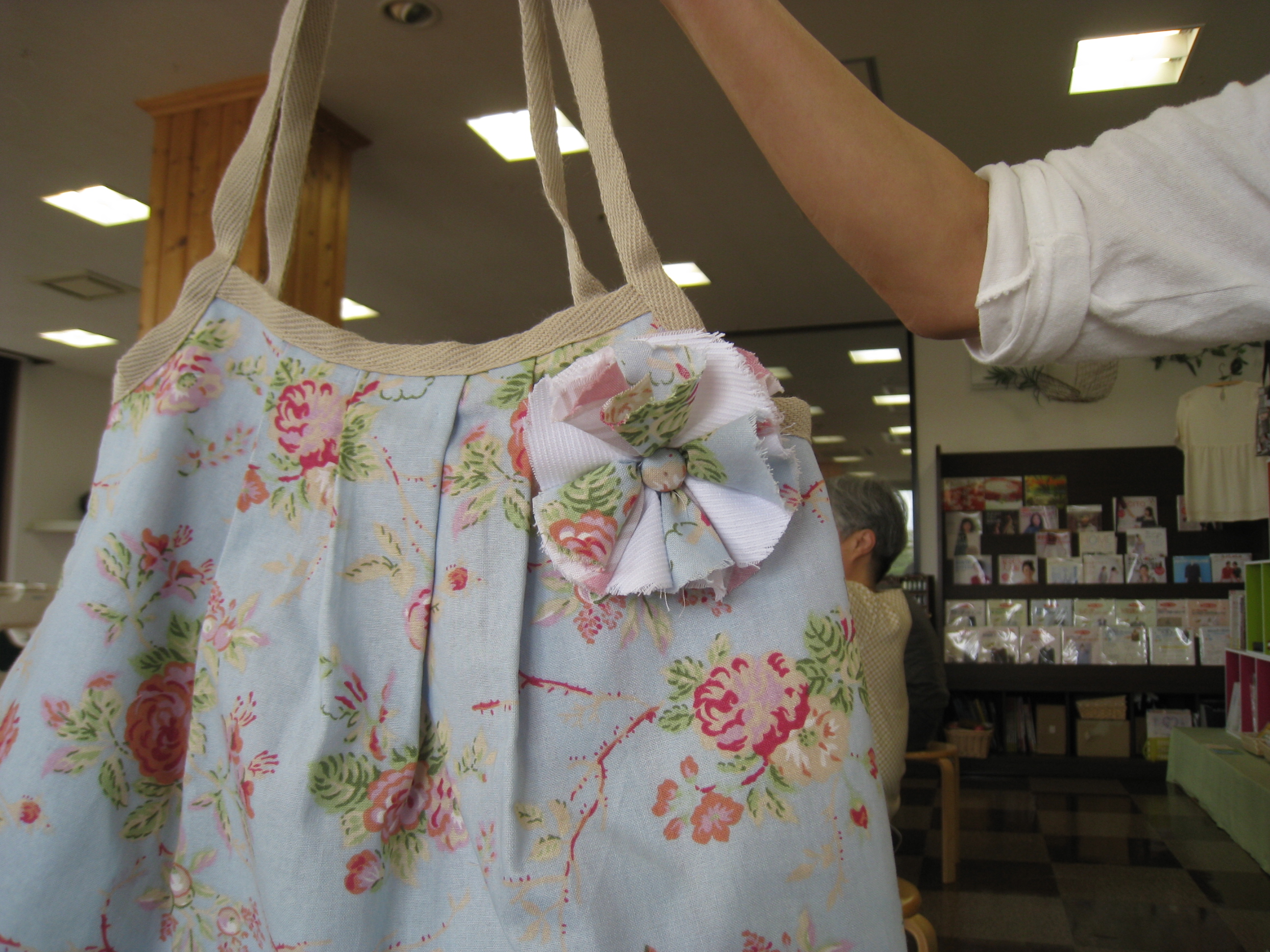 余り布でモチーフを『あっ』という間に作りあげ、すぐにバッグに飾りました。これも『らしい』ところ