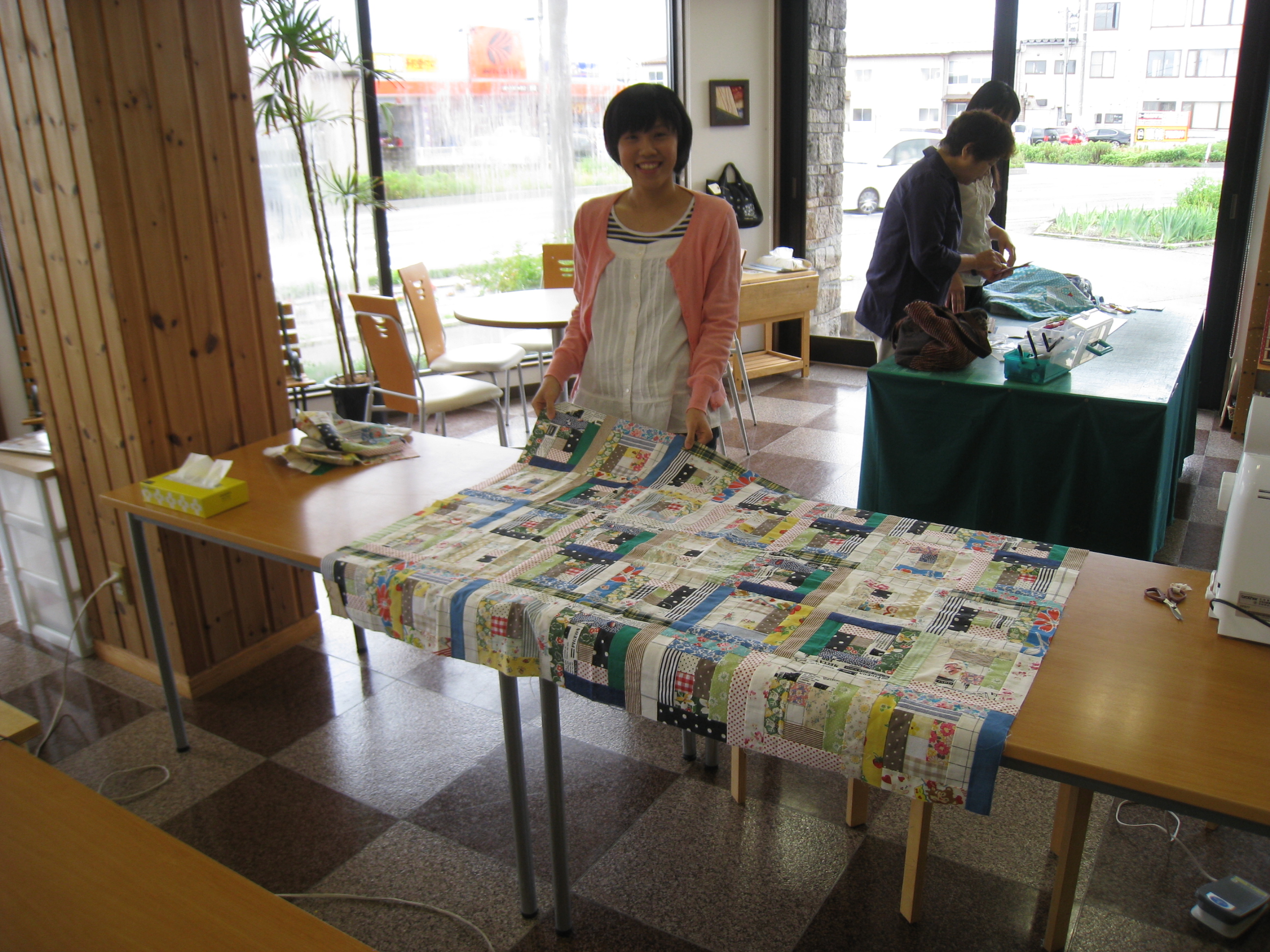 ミシンキルトでログキャビンのピースを何枚も作ってそれをつなげています。『がんばったねー』