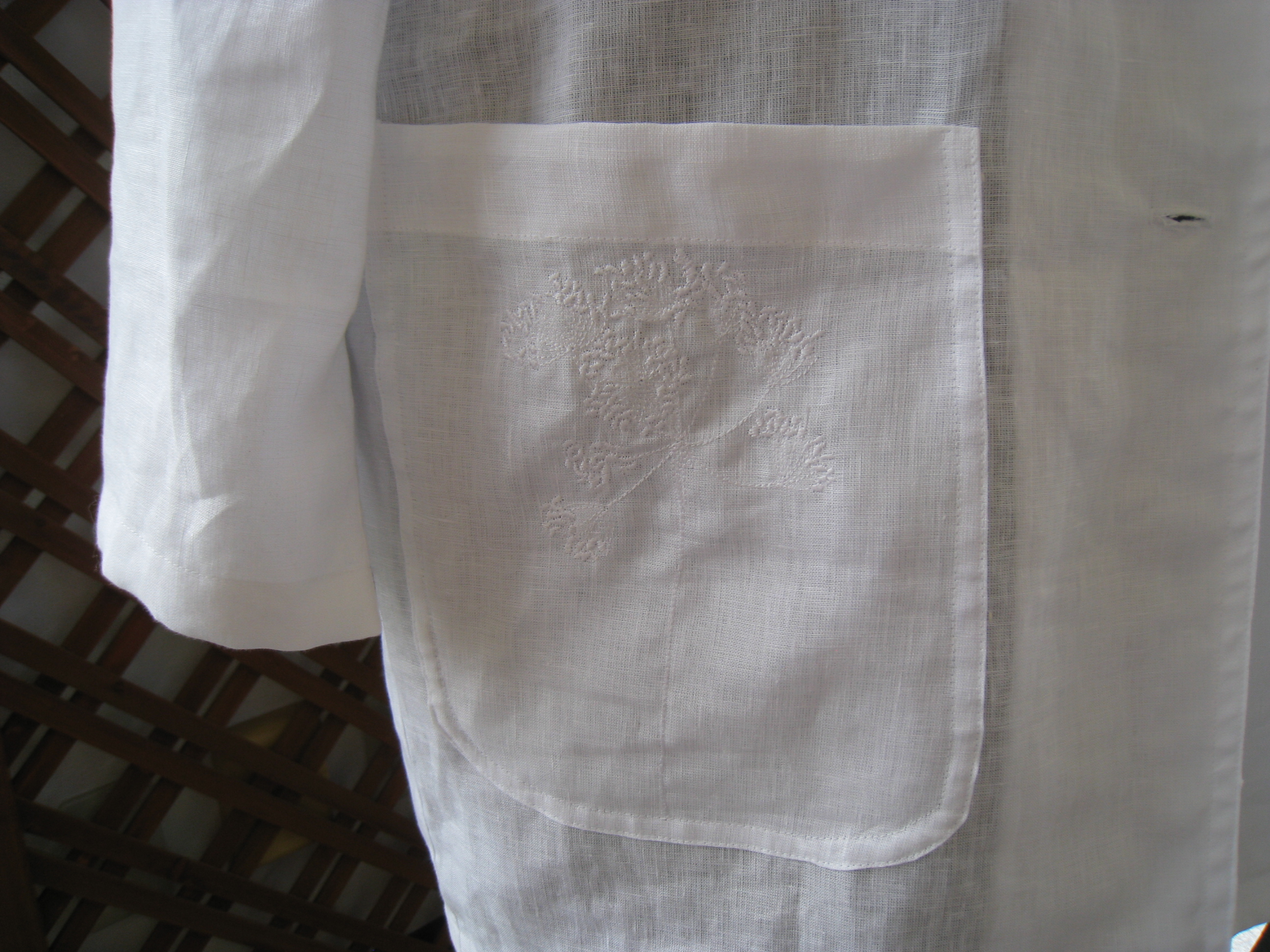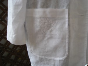 これ、背中とポケットにさりげなく白の刺しゅうを入れています。白地に白の刺しゅうって上品な