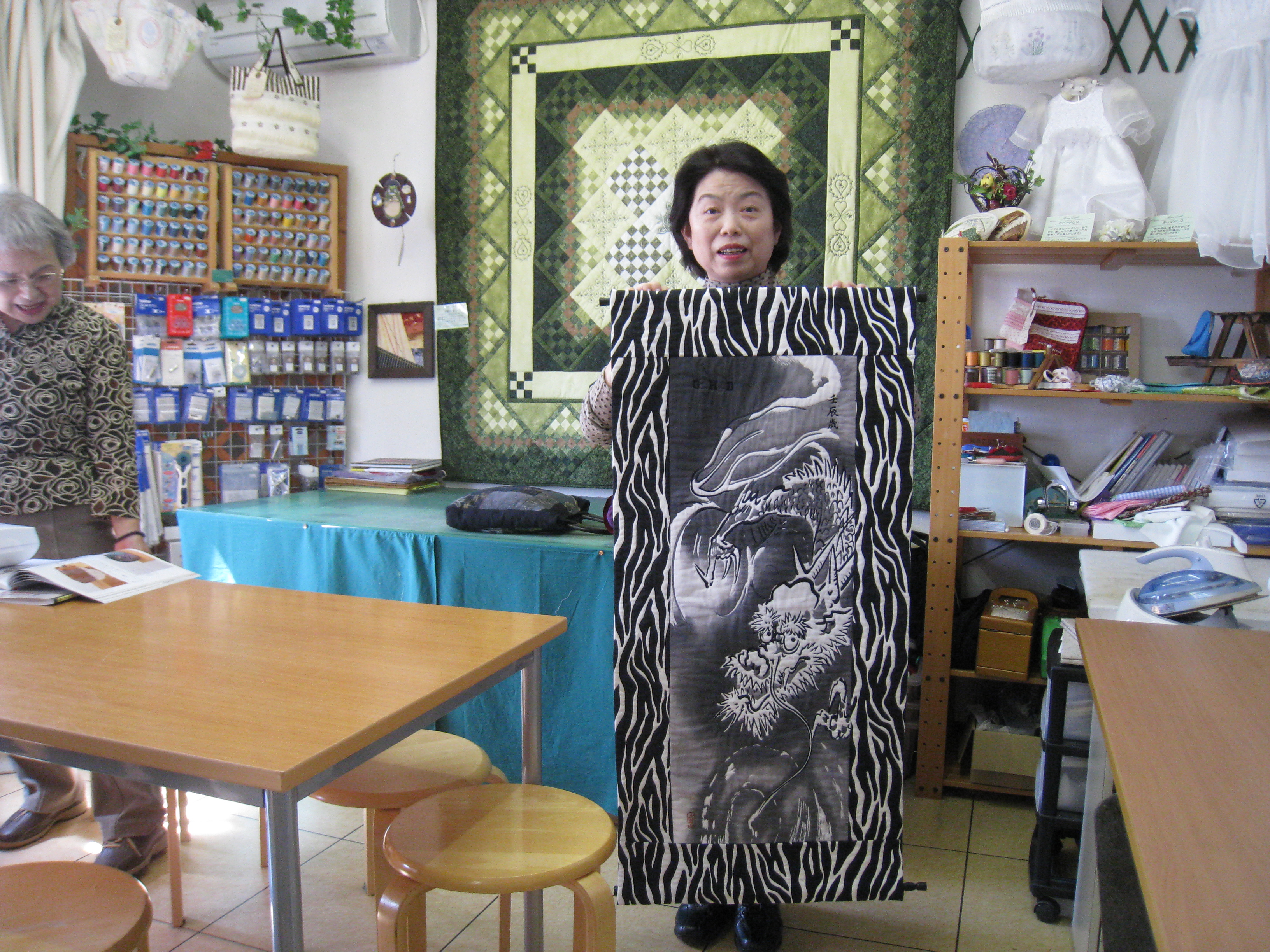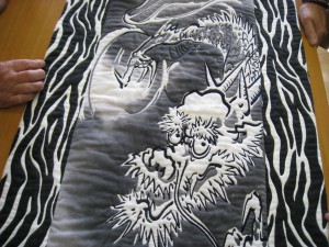 今日は講習会前に竹澤さんが、前から作っていた『龍のタペストリー』の完成品を見せに来店。