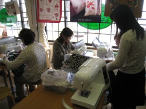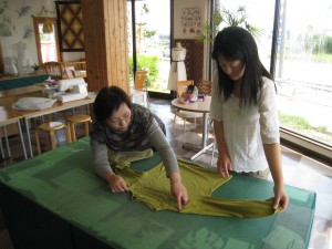 午前の部に参加の後藤さんと神部さん。藤島の五十嵐さんから譲ってもらった生地を使って