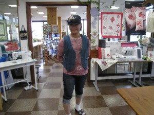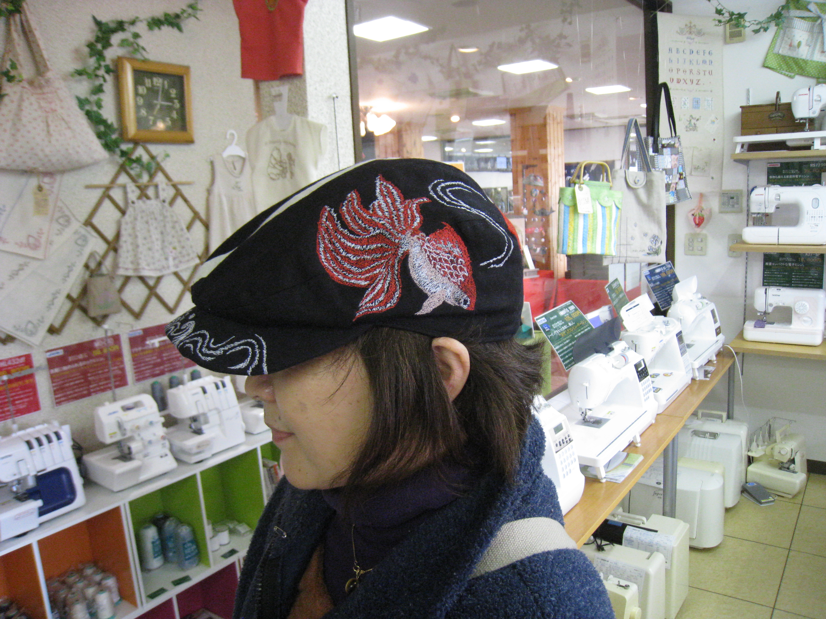 またまた、できたばかりの帽子を見せてくれました。前回はフリーモーションで作った『金魚』