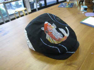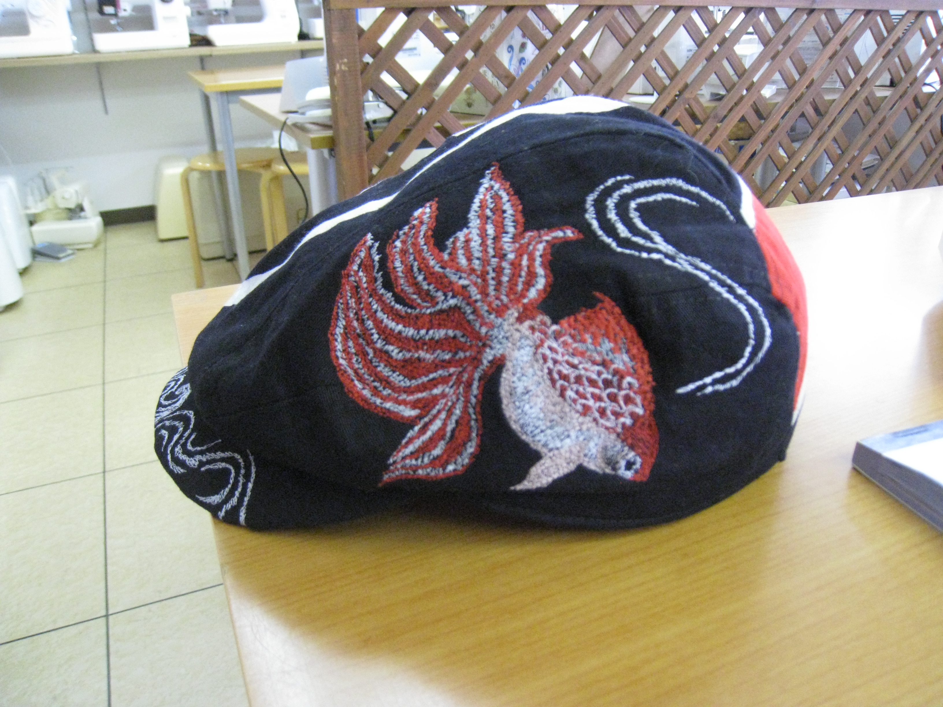 の刺しゅう入りの帽子でしたが、今回はなんと喪服の生地から作った帽子に『錦鯉』の刺しゅうを