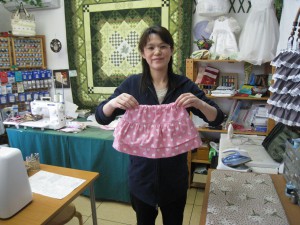 三川の荘司さんは、早速娘さんに作ったスカートを披露してくれました。ピンク地に白のハート柄