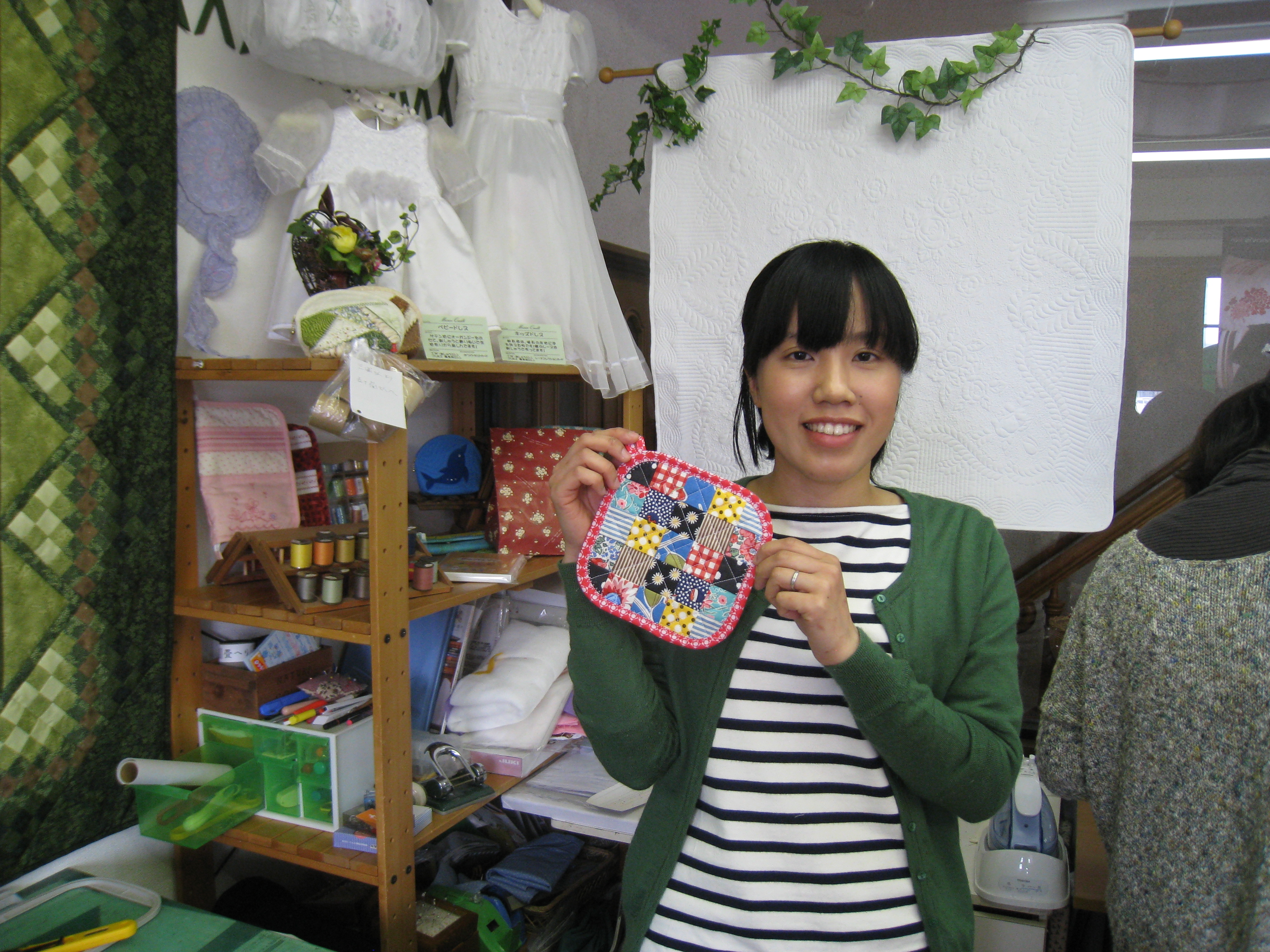 三川の佐藤さんは前回から作り始めた『キルトの鍋つかみ』を作成中!今日はバイアスで縁を
