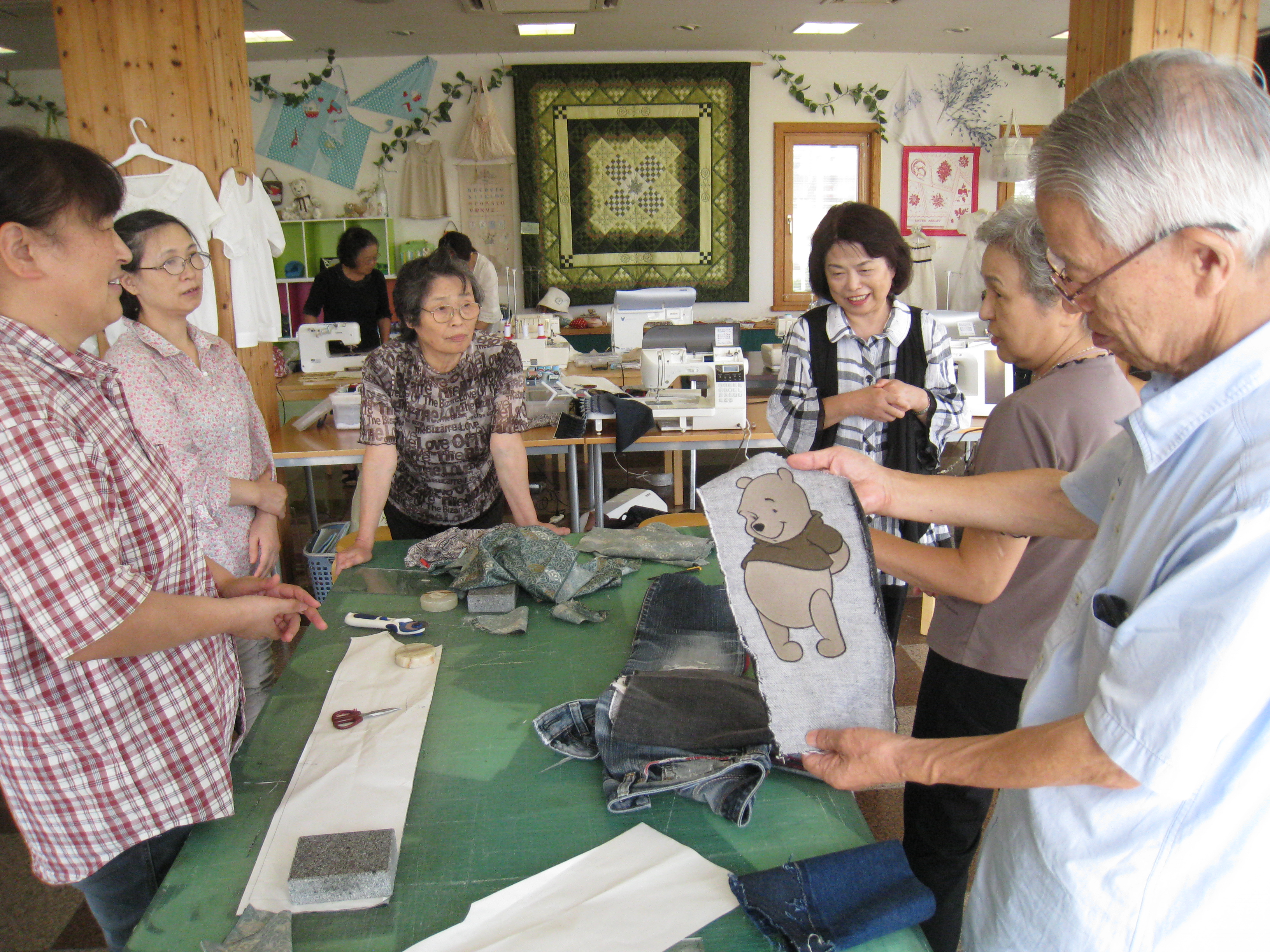 した穴の開いたジーンズを持って来てくれて、その部分にプーさんのアップリケを入れよ