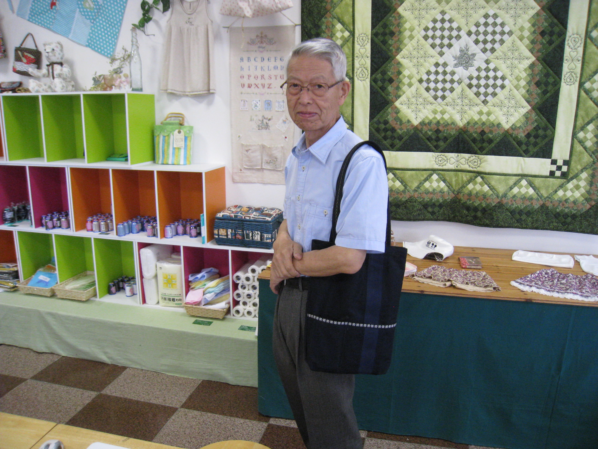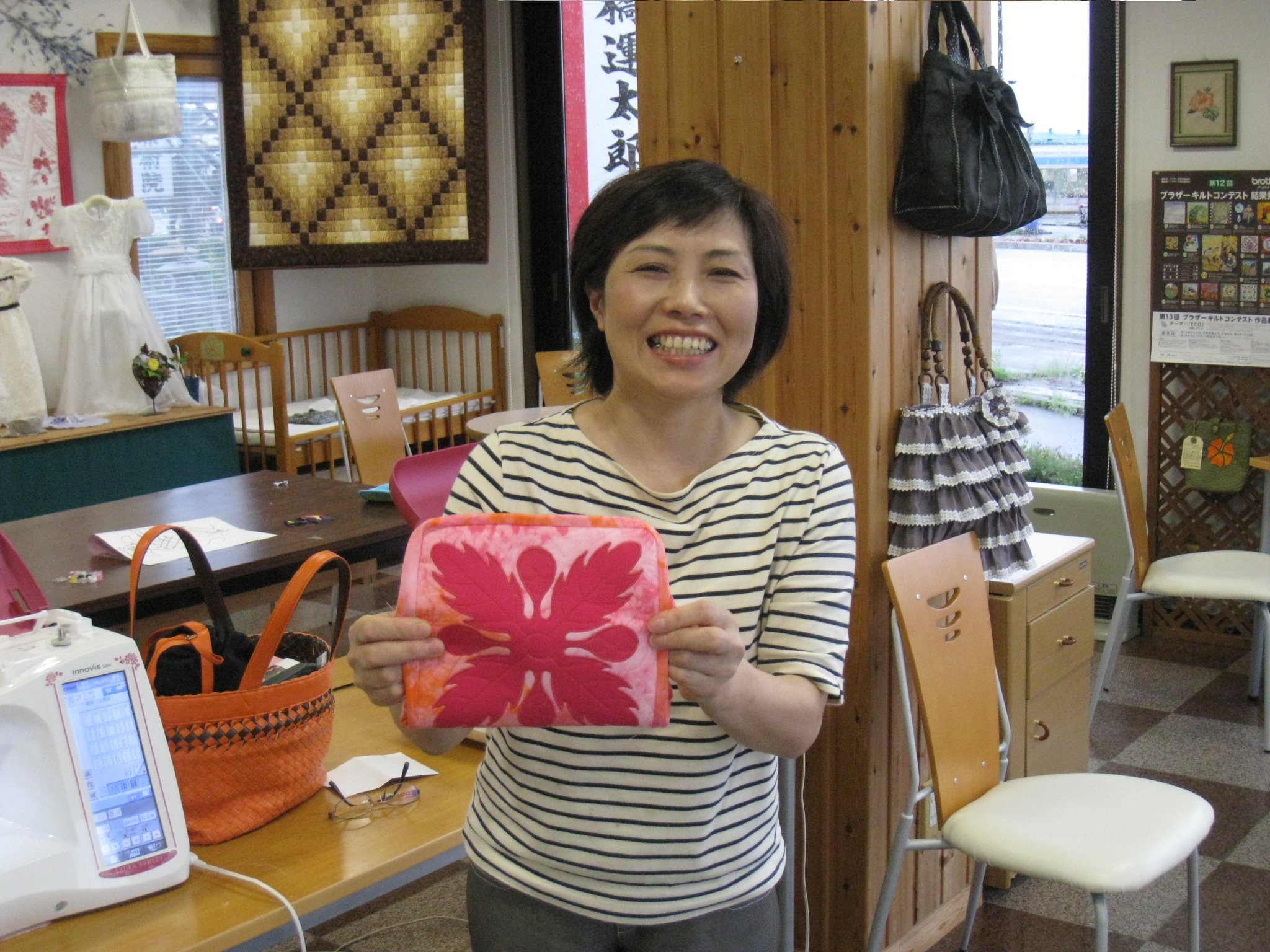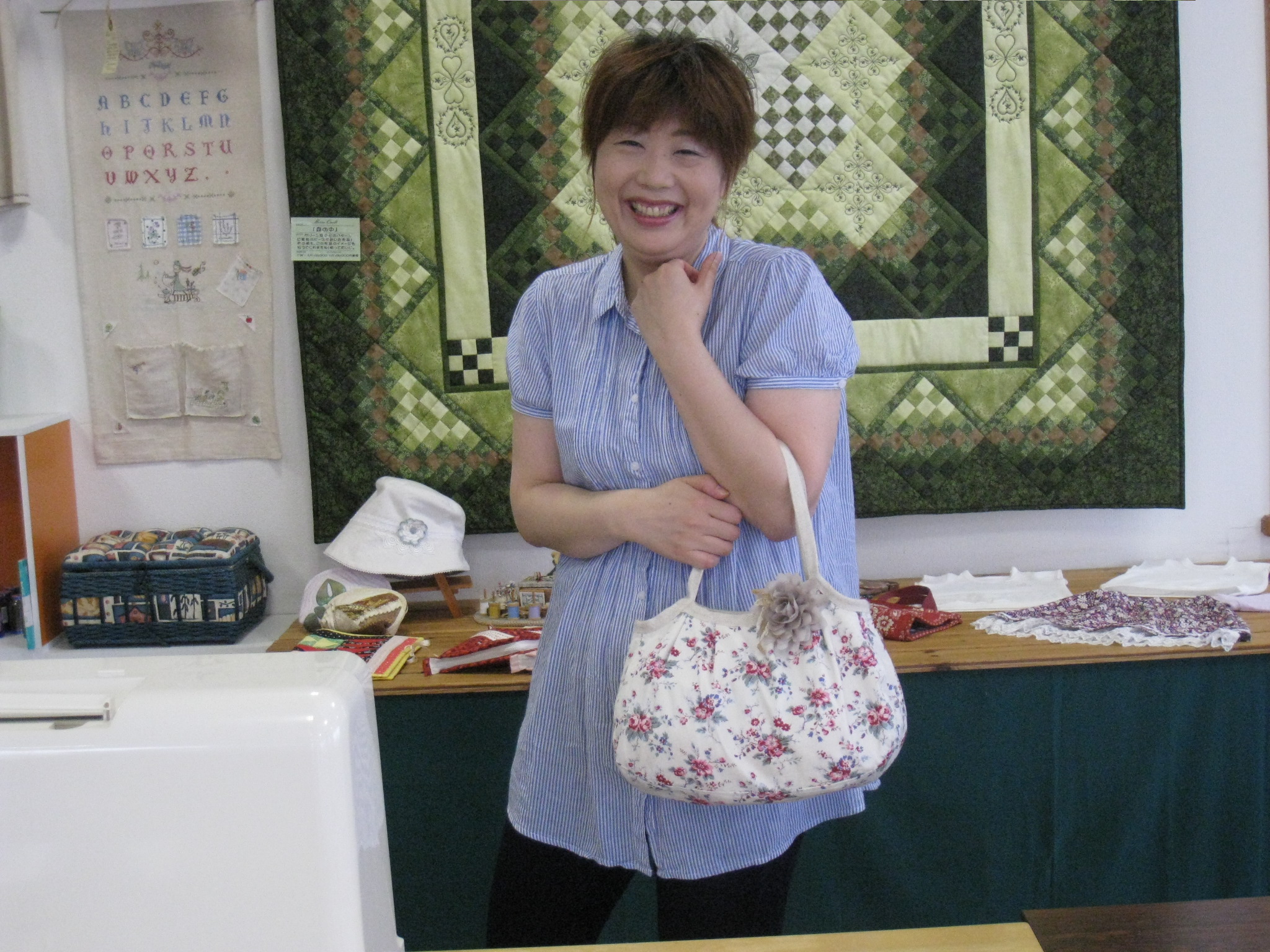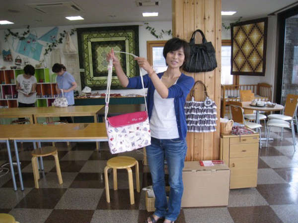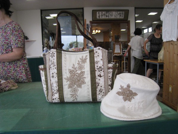 火曜日コースの後藤さんはスラッシュキルトのバッグを完成です。生地と刺しゅうと