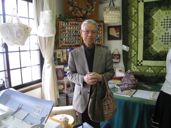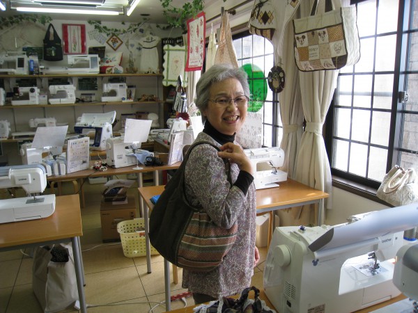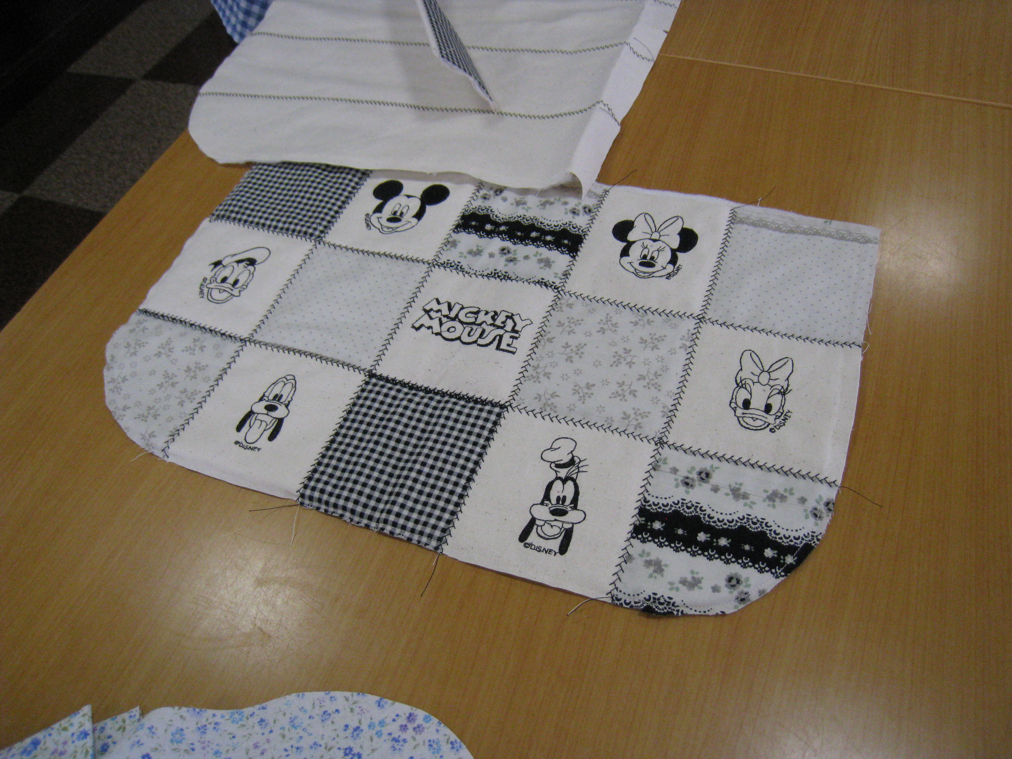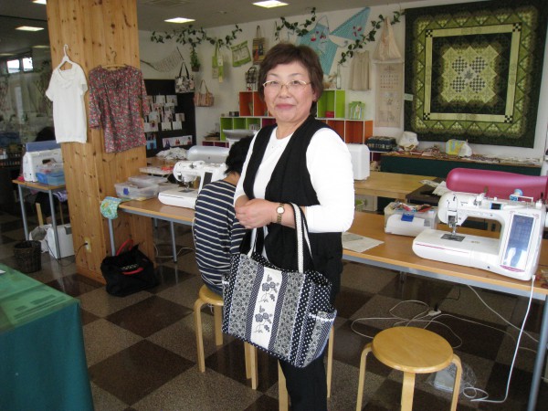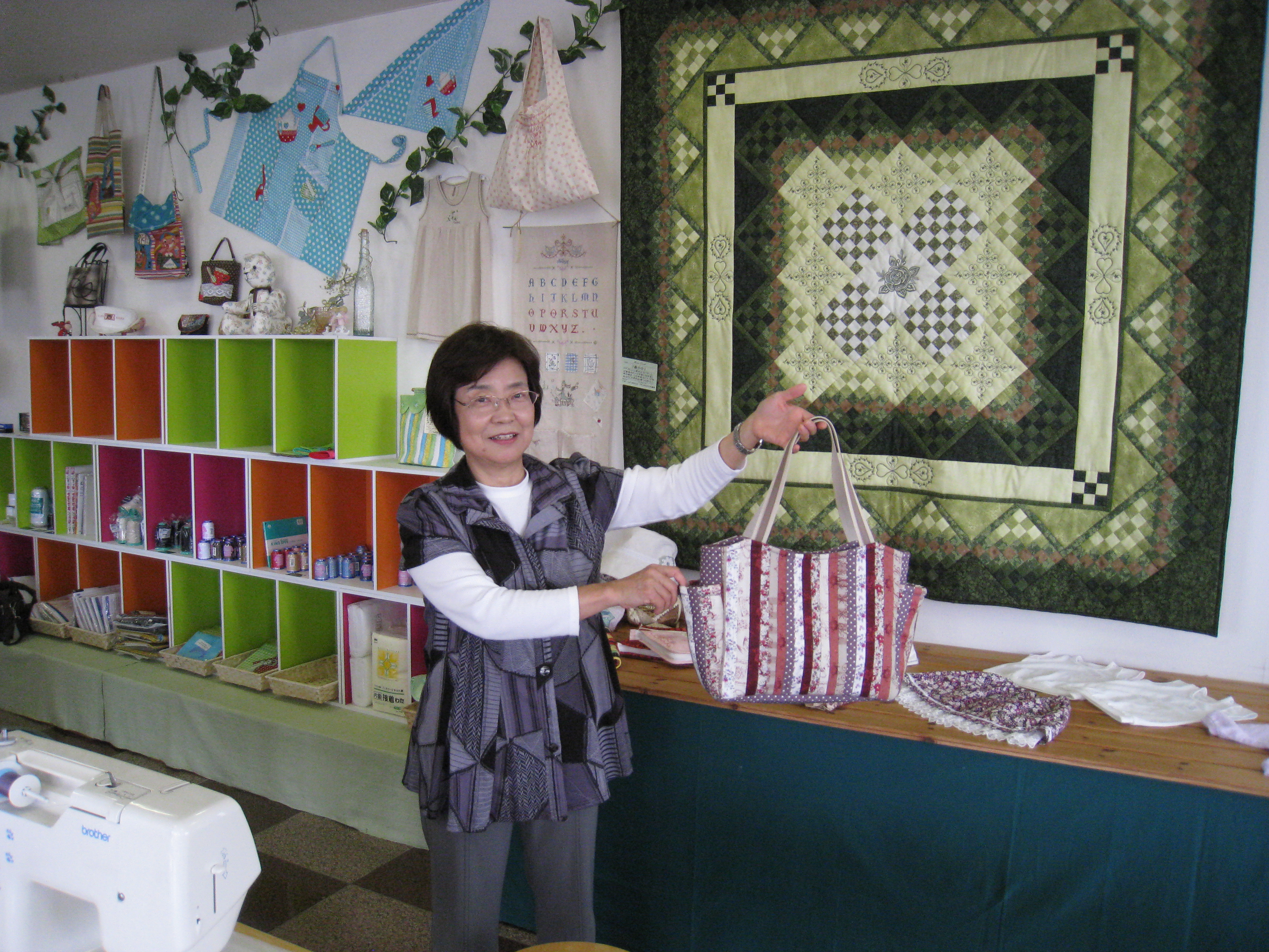 その粕谷さん、同時進行のキルトバッグが完成です。最近当店で人気のキルトバッグの布