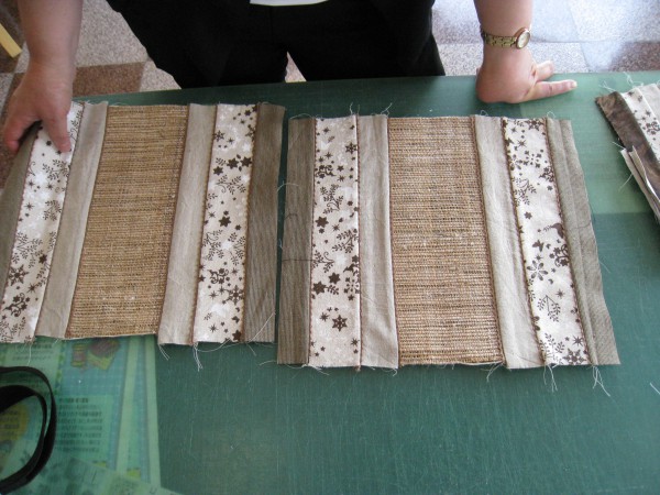 そんな中、早坂さんがキルトバッグを完成させました。エンジ系の色を組み合わせて