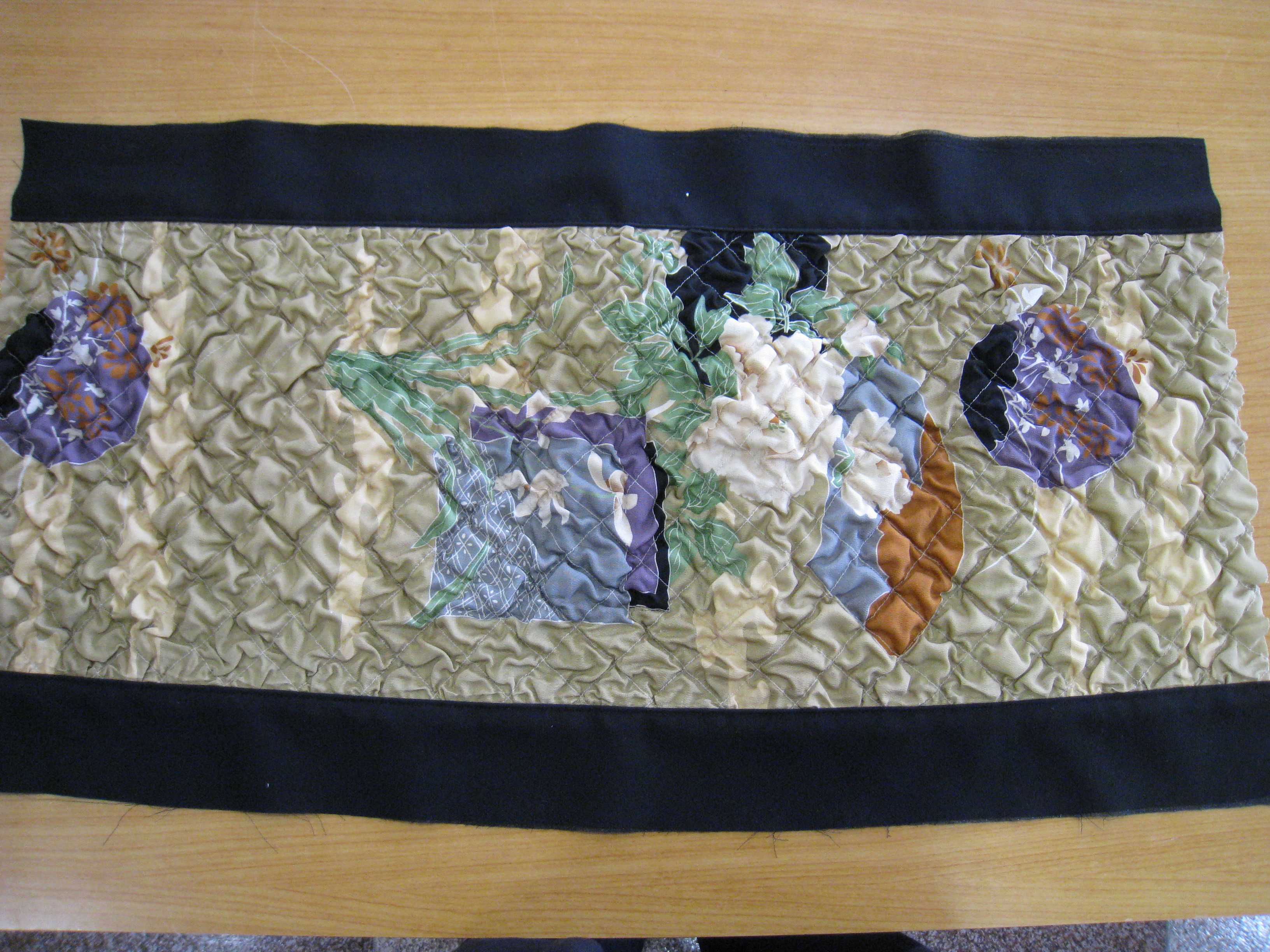 藤島の佐藤さんは『縮むシート』を着物地に使ってバッグを作成中です。今日は縮めた