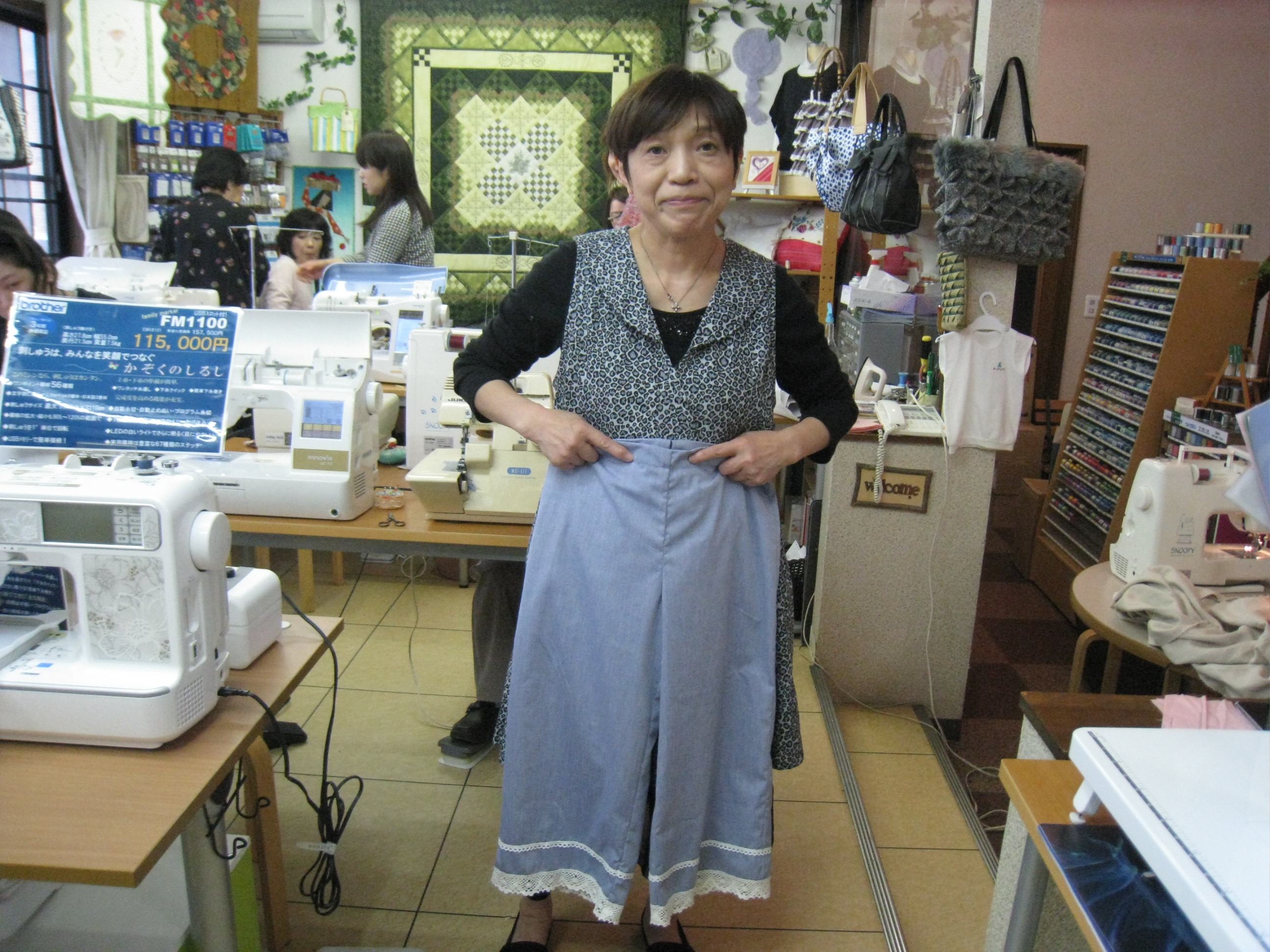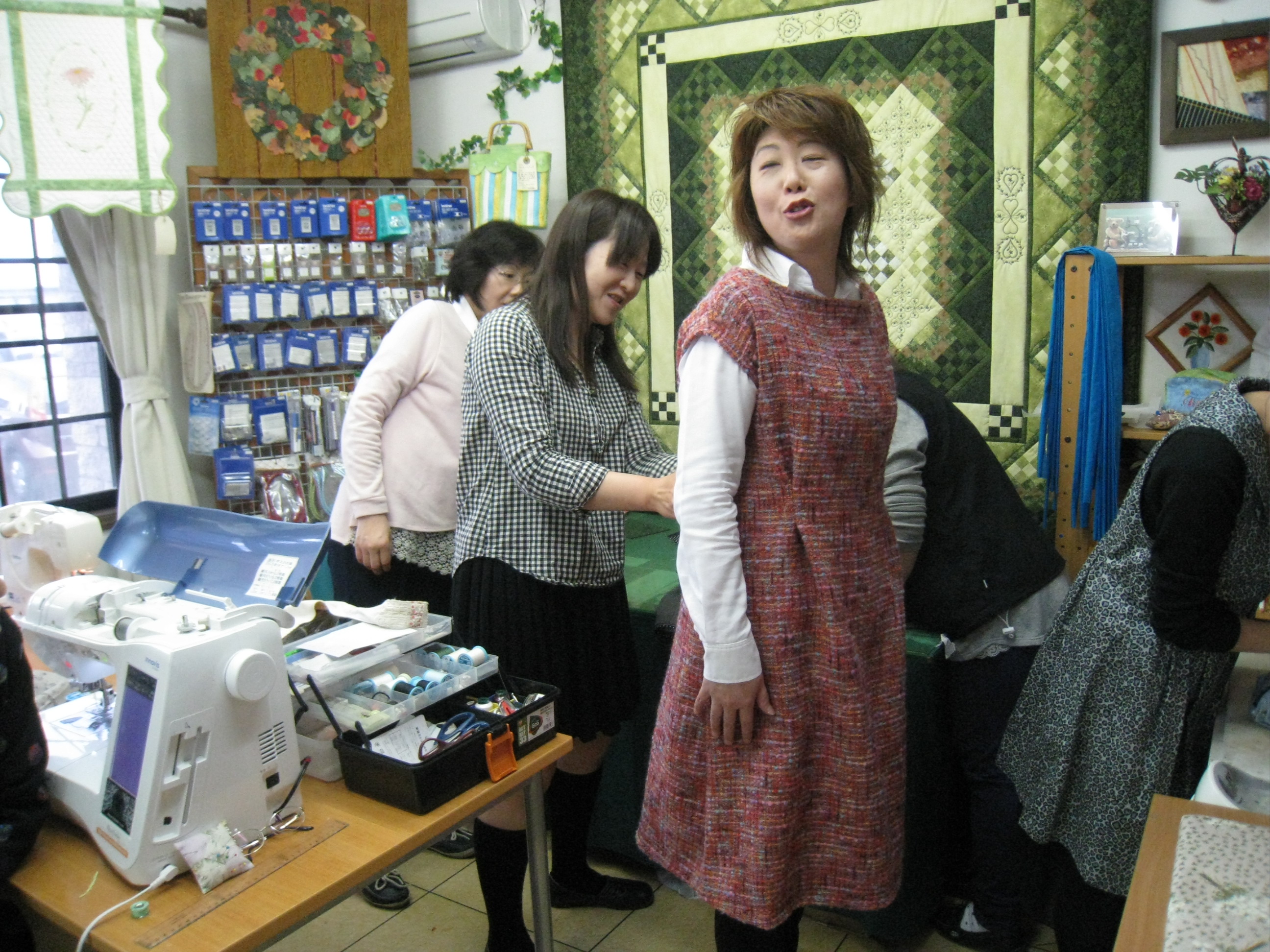 先程の日枝の五十嵐さんは『ジャンバースカート』?が間もなく完成です。試着してみる