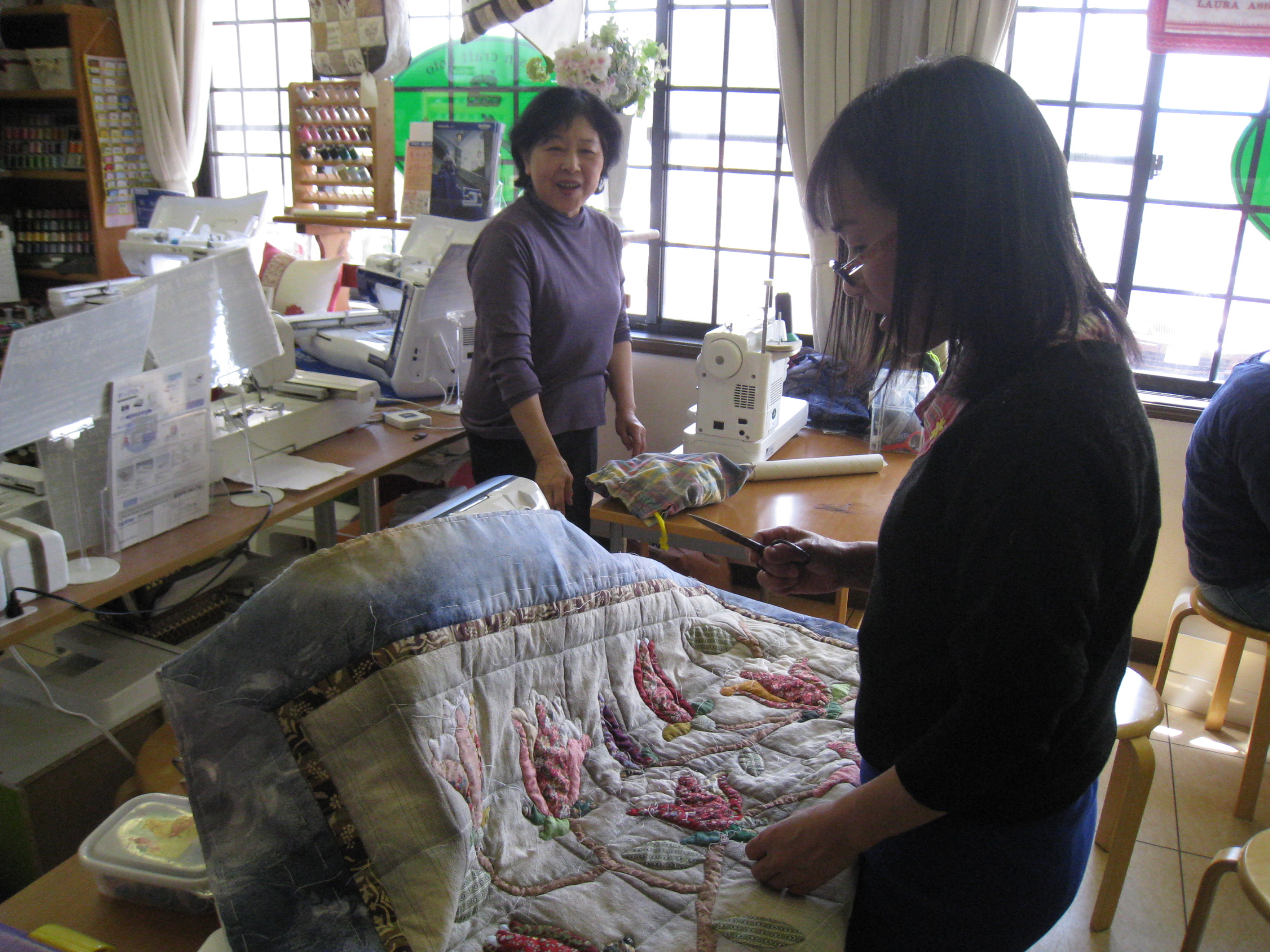 午前の部では河野さんのハンドキルトの木蓮のタペストリーが間もなく完成です。