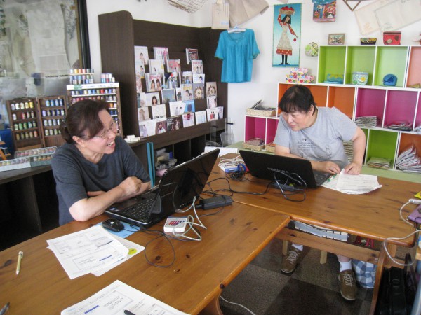 山木さんはペーパーファンデーションのポーチを作成中。とにかく笑顔で楽しそうです。