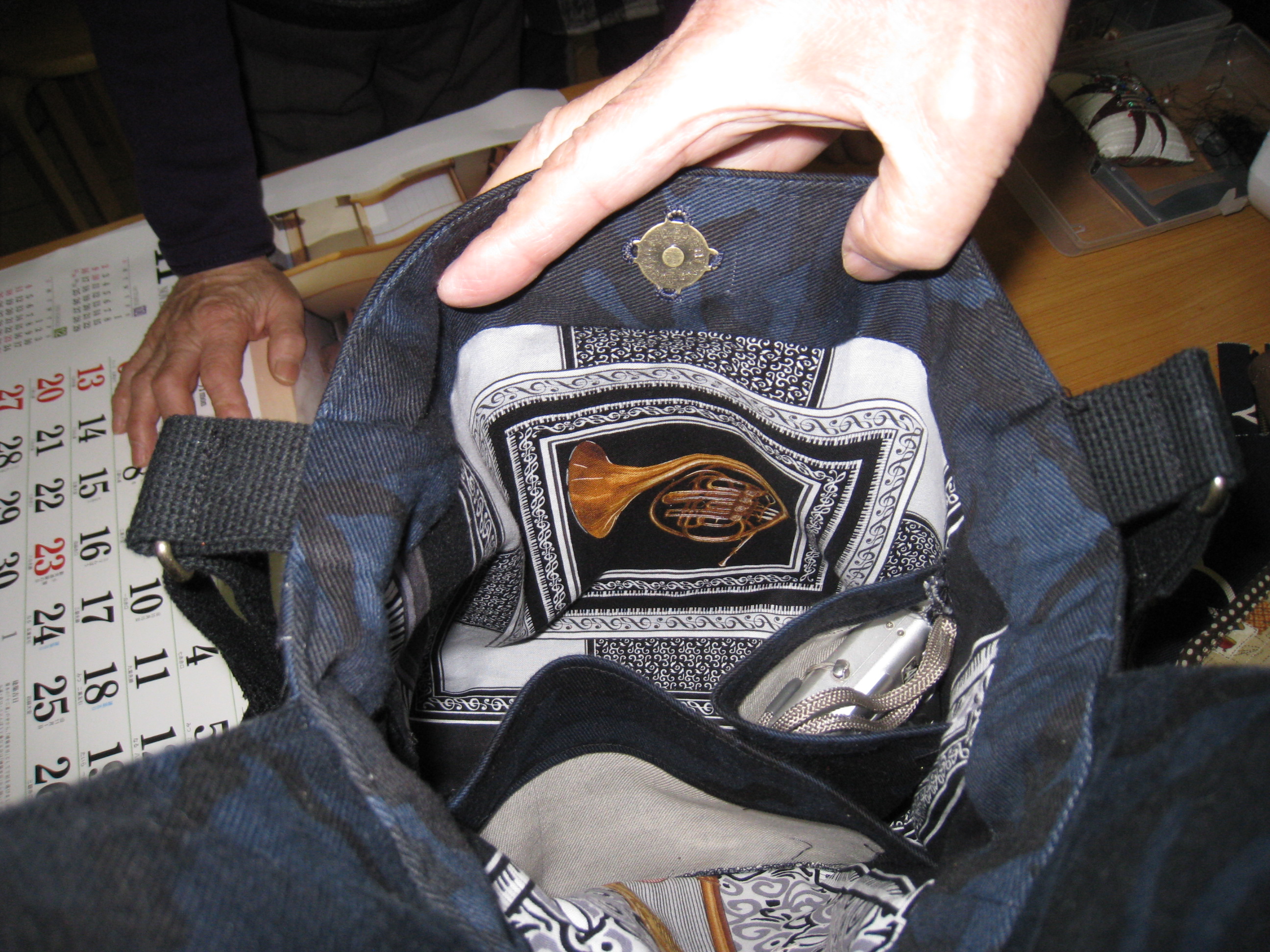 合わせたデニムの配色がかっこいいバッグです。このバッグ、裏地にトランペット?の